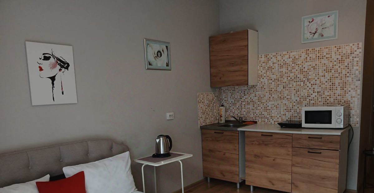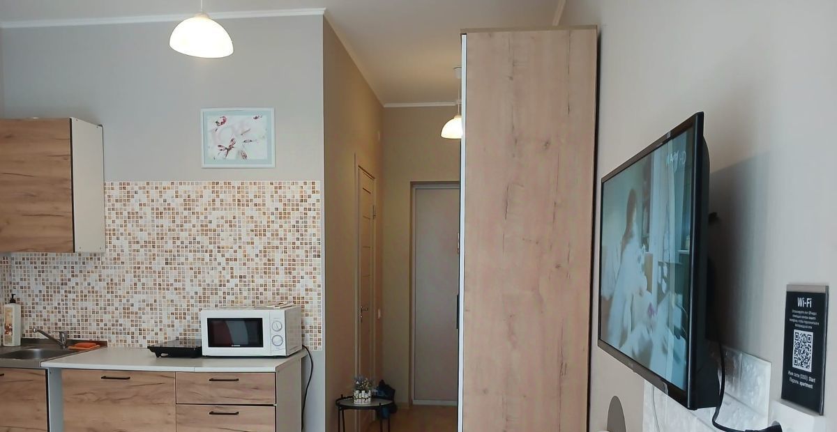 Студия выполнена с заботой о вашем комфорте: качественный евроремонт, мебель в комнате и на кухне, а также вся необходимая техника — холодильник, телевизор и стиральная машина. Санузел совмещённый, оборудован современной душевой кабиной, поэтому можно быстро освежиться после долгого дня.