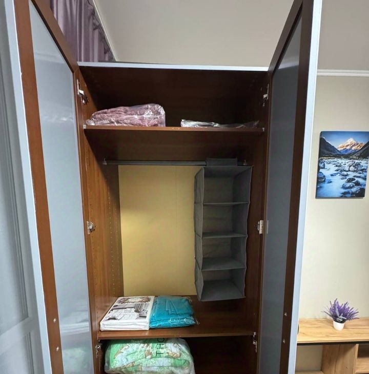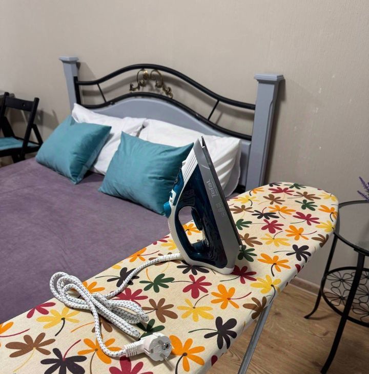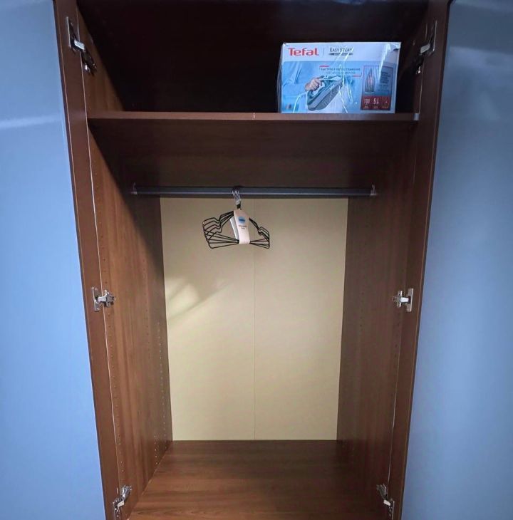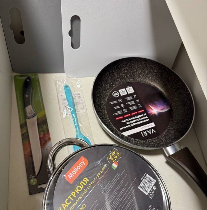 двуспальная кровать, 2 шкафа, кухонный гарнитур(духовки нет), стол, стулья, небольшой холодильник, микроволновка, индукционная плита, духовки нет, чайник. Новая посуда (кастрюля, сковорода, столовые приборы), тарелки, чашки. Новый утюг, гладильная доска. Текстиль тоже новый. (постельное белье, полотенца). Есть одеяло и подушки.
