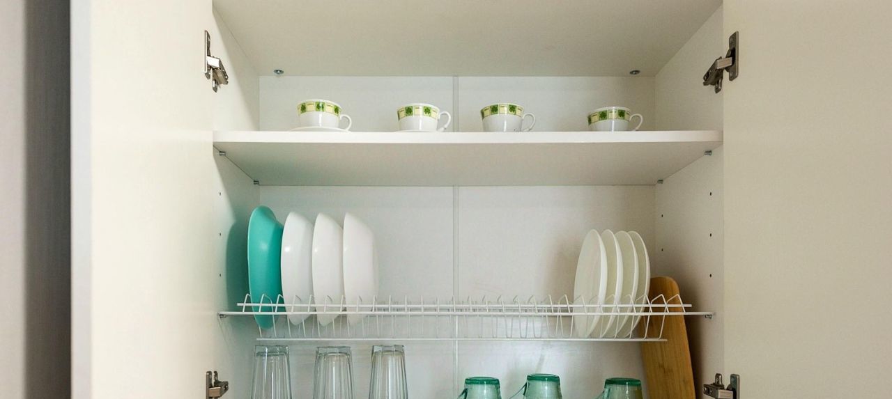 Есть сушилка для белья и гладильная доска, посуда.