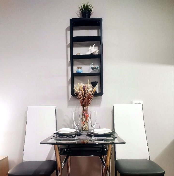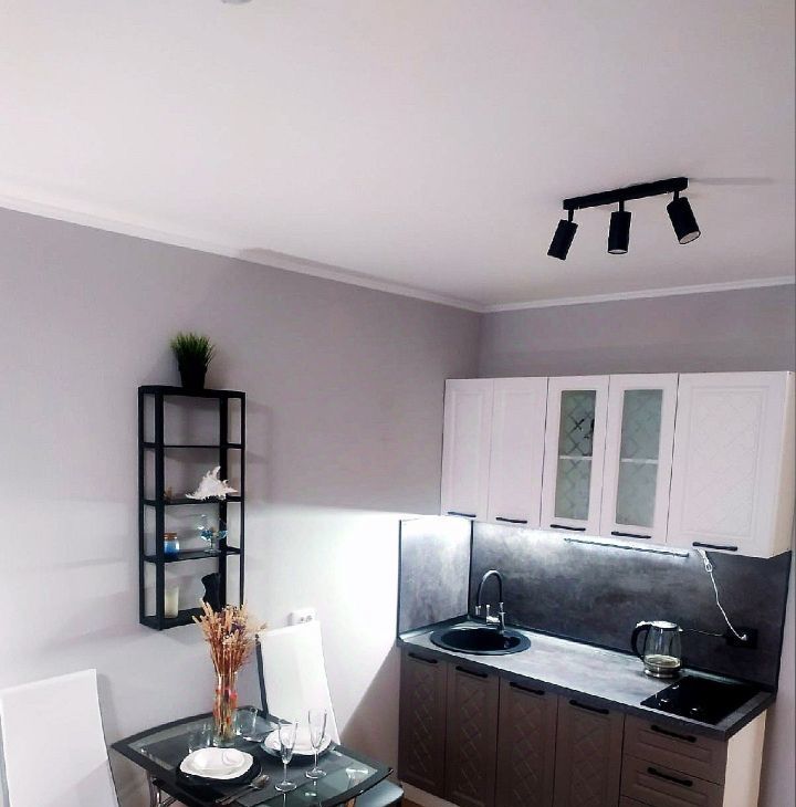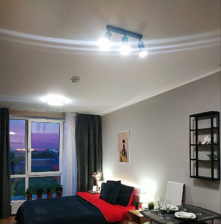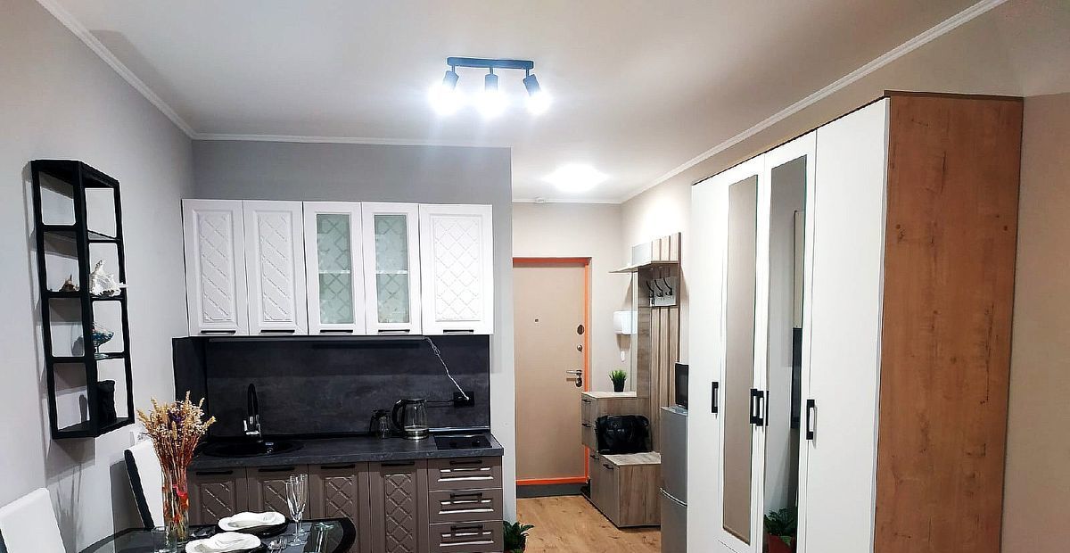 Эргономично укомплектована всей необходимой мебелью и техникой, в т.ч. высокоскоростной Wi-Fi интернет, смарт-ТВ Samsung, стиральная машинка LG на 6кг загрузки, холодильник с отдельной морозильной камерой, микроволновка Gorenje, керамическая плита, утюг Tefal, фен, гладильная доска, вместительный зеркальный шкаф, стеклянный стол, стулья, светильники, диодное освещение. Удобная двухместная кровать с ортопедическим матрасом Аскона.