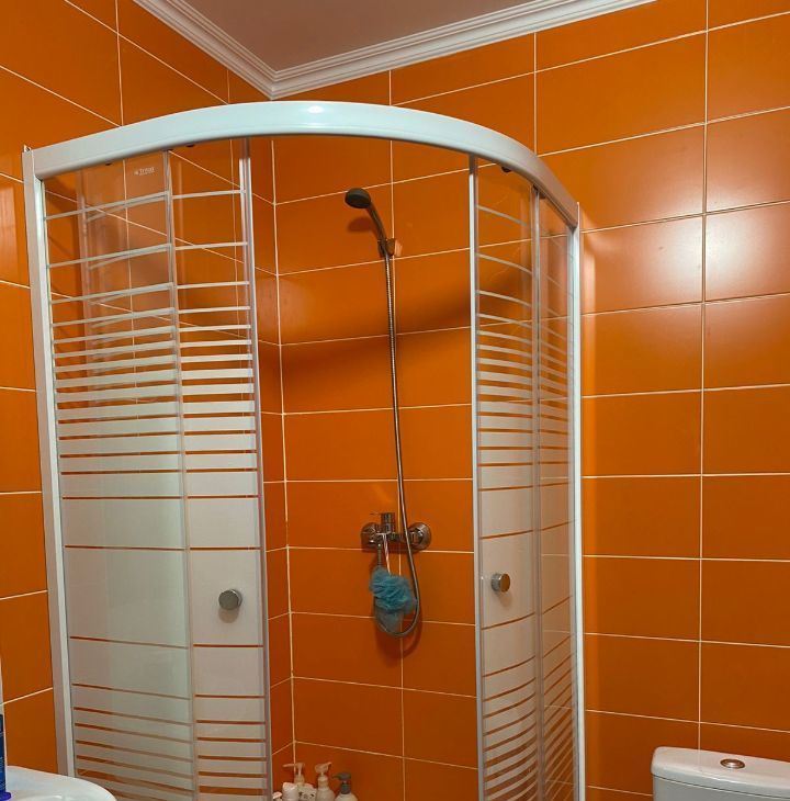 Ванная комната с вместительной душевой кабиной и стиральной машиной