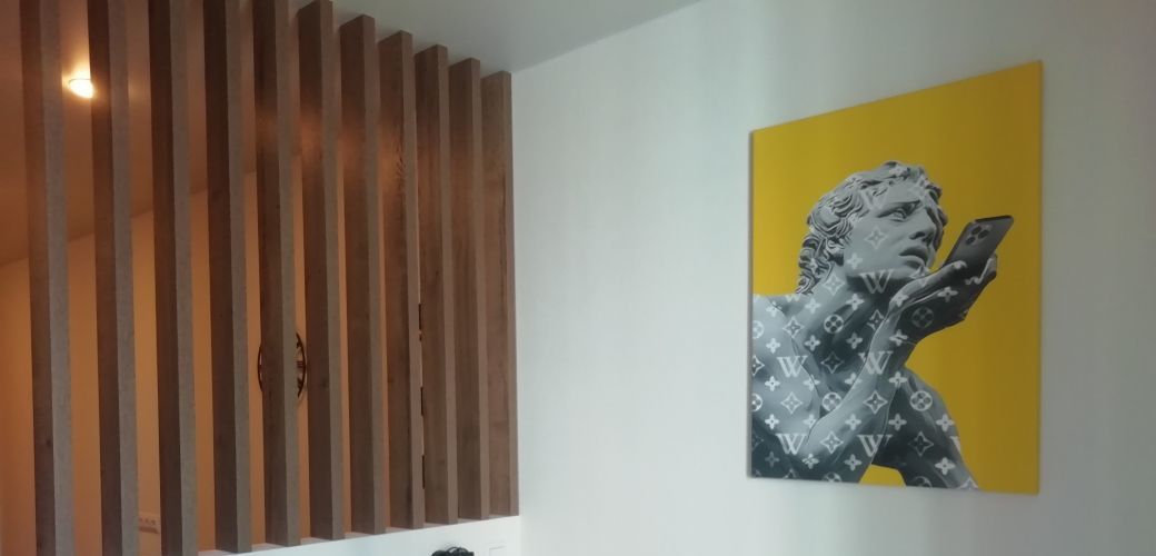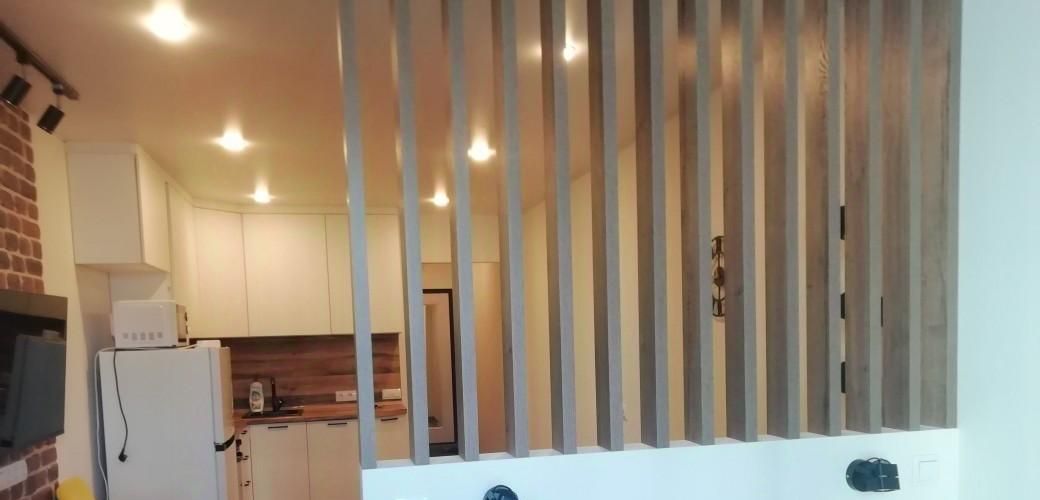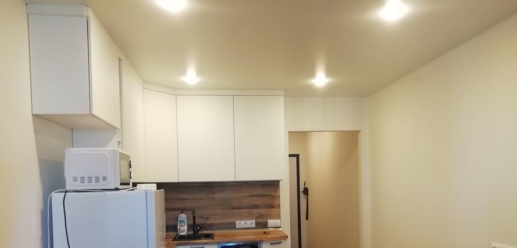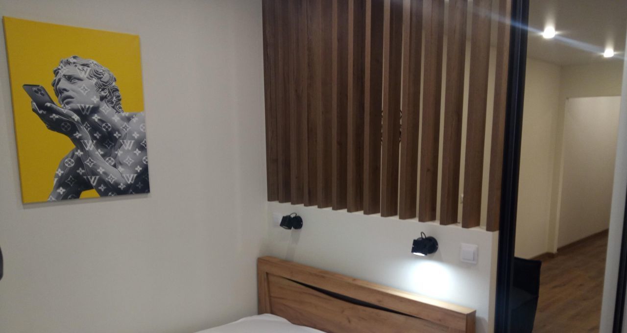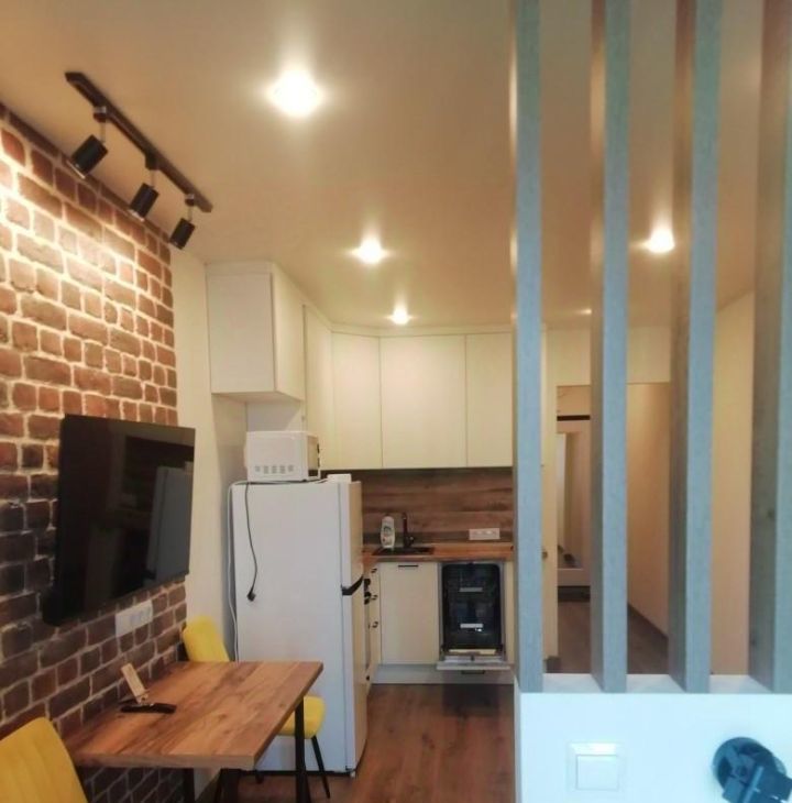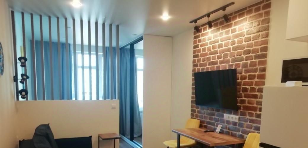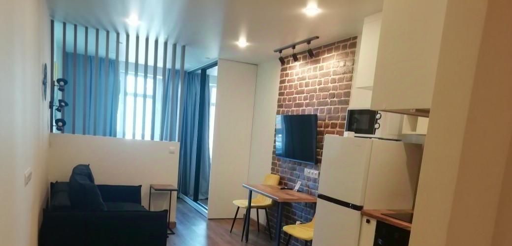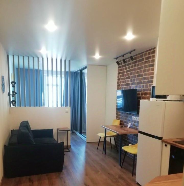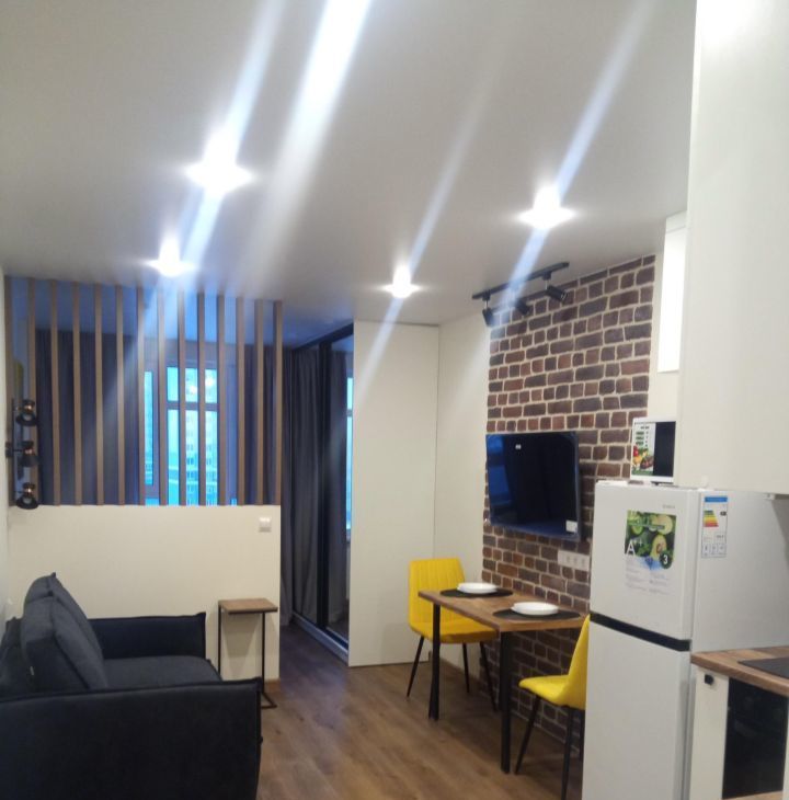 Студия разделена на 2 зоны: спальня и кухня-гостиная. Спальная зона оснащена кроватью шириной 140 см с ламелями и пружинным ортопедическим матрасом фирмы Аскона. В гостиной зоне установлен диван с ортопедическими пружинными блоками и спальным местом 140 см. Диван можно раздвигать частями, что позволяет создать 4 полноценных сидячих места для удобного общения с Вашими гостями. Выполнено световое зонирование и электронное диммирование (регулируется яркость освещения), дарящие повышенный уют и комфорт.