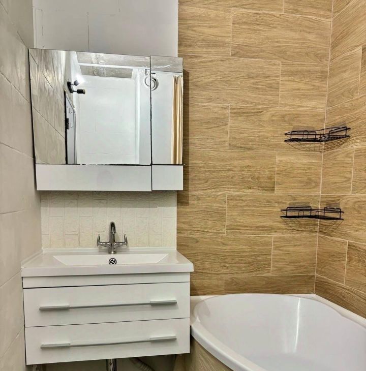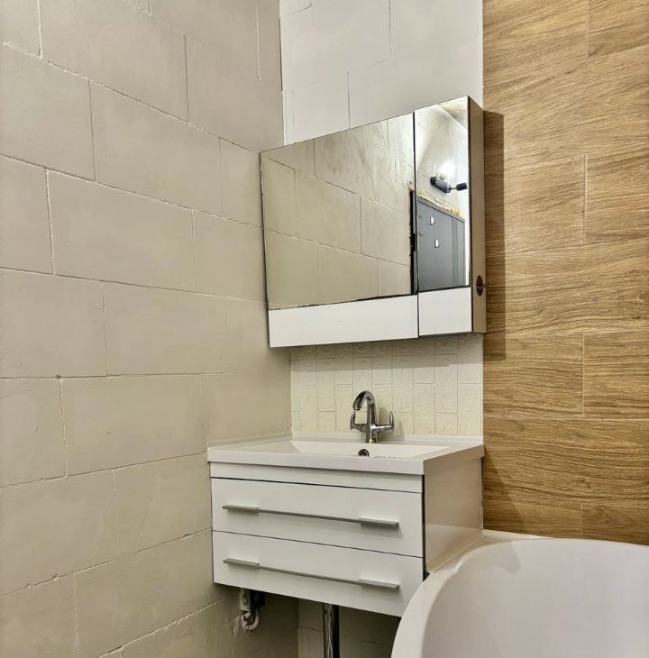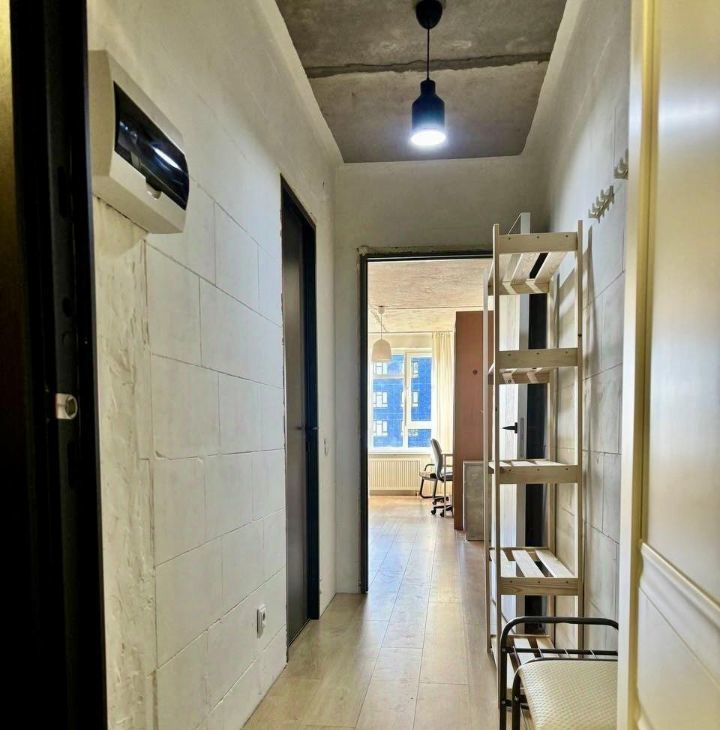 В квартире выполнена стяжка и установлена качественная тяжелая входная дверь с отделкой из дерева. Дизайнерские межкомнатные двери метал+дерево+кожа. В квартире положен ламинат, в прихожей плитка и ламинат. В санузле: плитка, ванна акрил, итальянский унитаз, гарнитур, новая стиральная машина (1 год). Кухонный гарнитур, холодильник. Диван, шкаф, рабочий стол. Все останется вам!