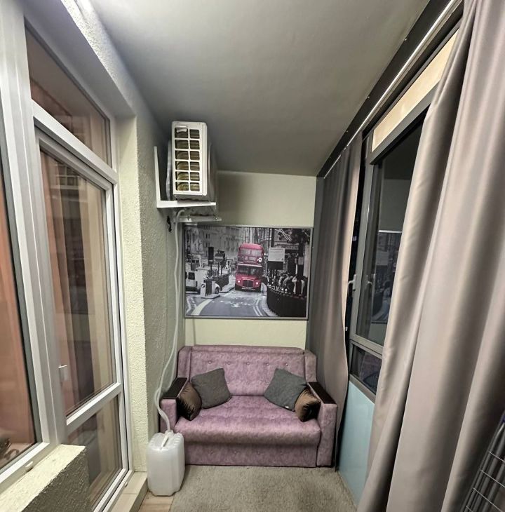 В комнатекухне всё необходимое для комфортной жизни: двуспальная кровать, кондиционер, холодильник, духовой шкаф, варочная панель, микроволновка, обеденный стол, телевизор. На балконе — диван, дополнительное пространство для отдыха.