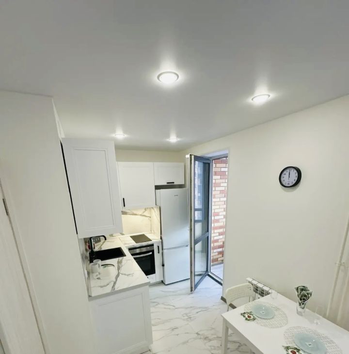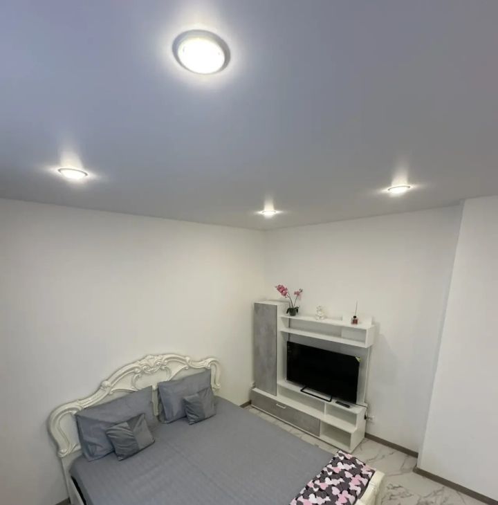 Потолок натяжной с прекрасным ярким освещением, на полу - светлый керамогранит.