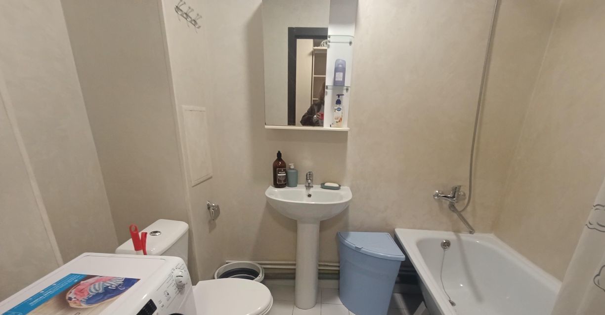 В студии есть вся необходимая мебель и техника: холодильник, посудомоечная машина, телевизор и стиральная машина. Планировка включает совмещенный санузел, что делает пространство более функциональным.