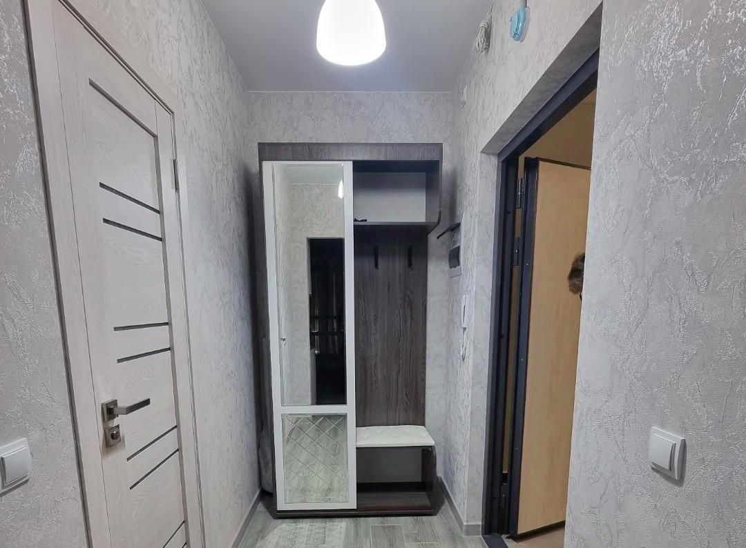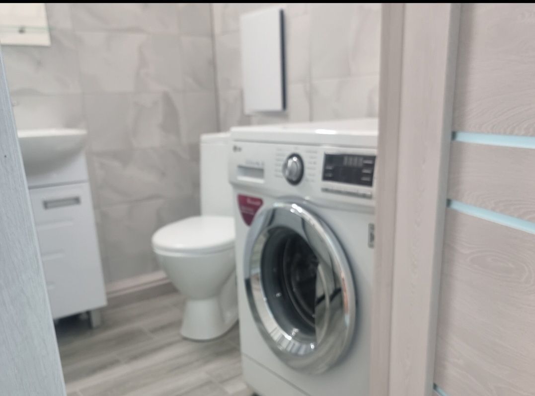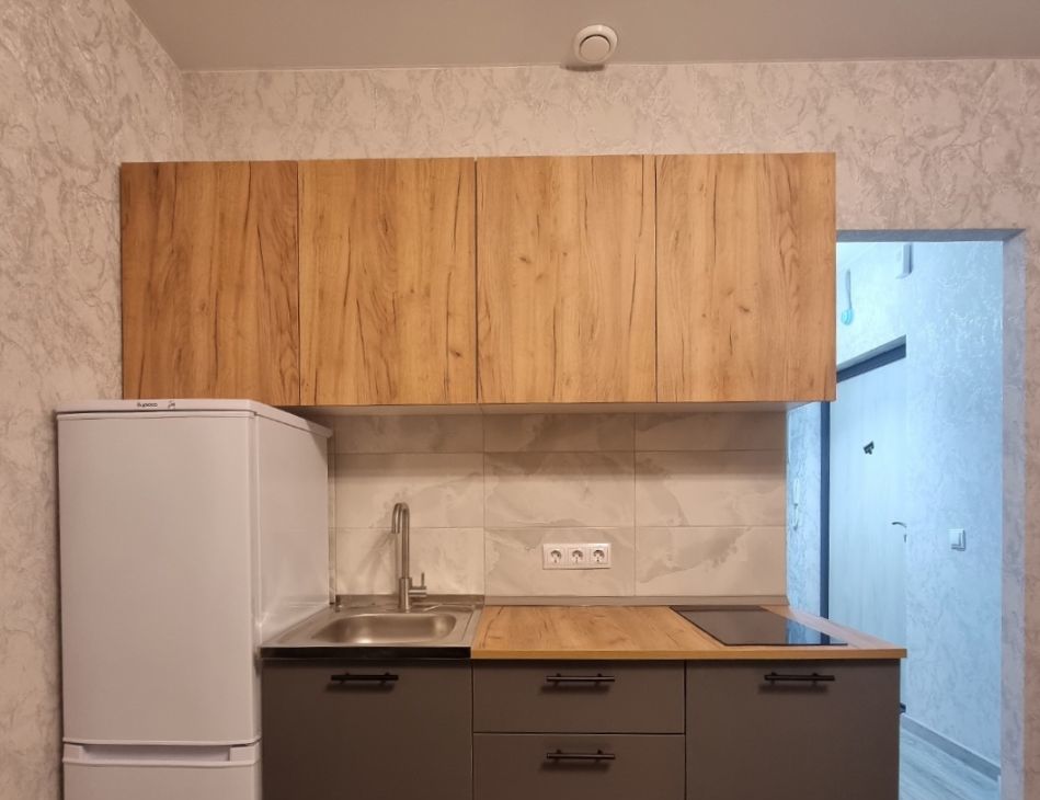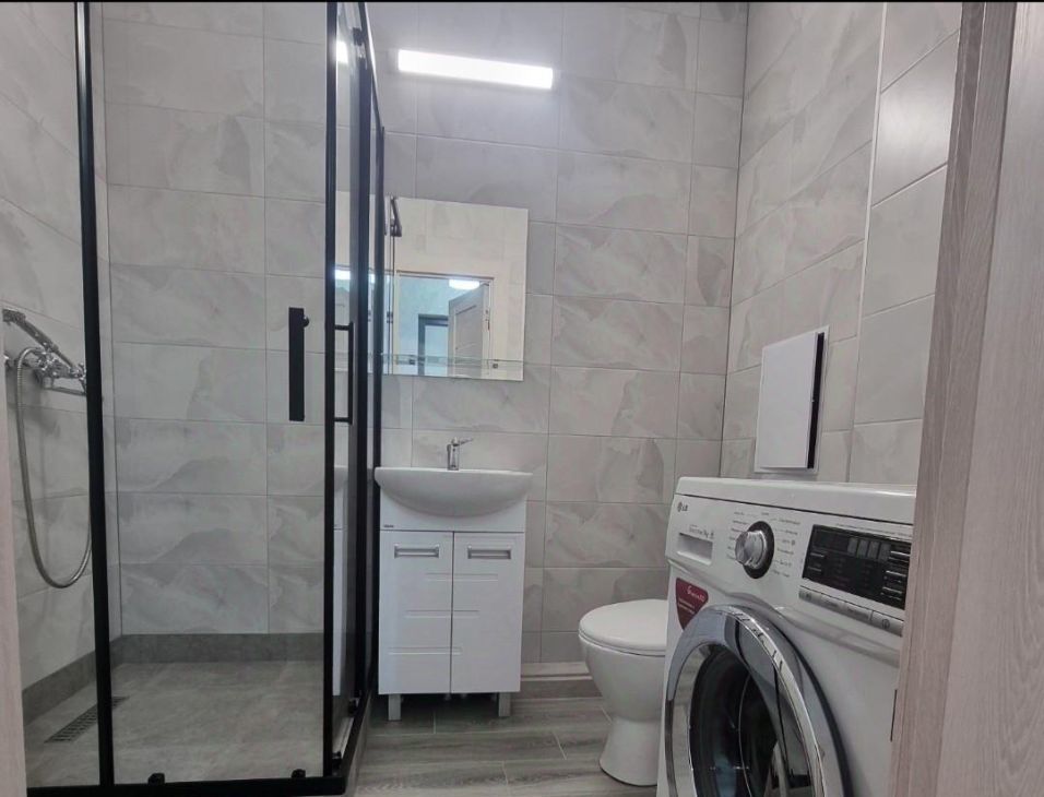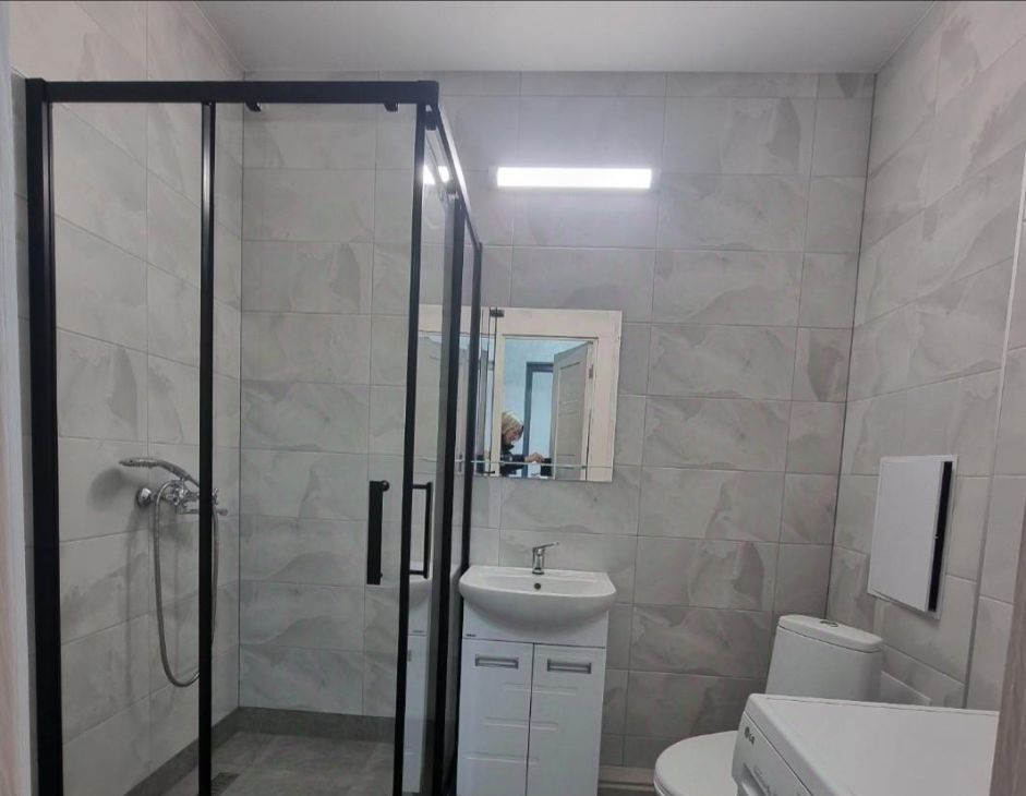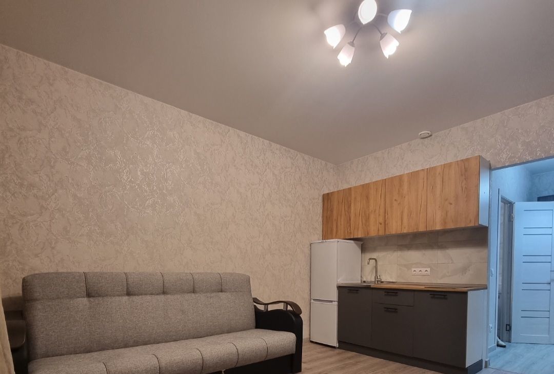 Студия с евроремонтом, полностью готова к проживанию. В комнате и на кухне есть вся необходимая мебель, мебель новая. Диван и обеденный стол, кухонный гарнитур, стенка, прихожая. На кухне вы найдете современную технику: холодильник и стиральную машину. В ванной комнате установлена душевая кабина.