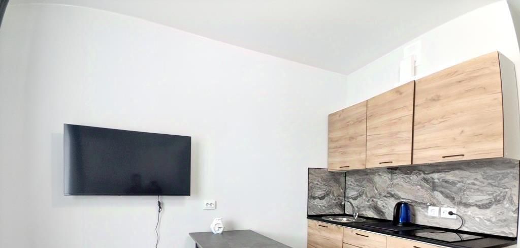 Сдаётся на длительный срок квартира-студия в ЖК "Чкалов". Остановка трамвая прямо у дома, до метро Купчино идёт 8 минут. Штатный поддон в ванной заменён на более надёжную небольшую ванну, которую разумеется можно использовать как душевую. Кухня с варочной поверхностью, холодильник, стиральная машина, диван-кровать, телевизор, стол, табуретки, тумба с ящиками для вещей (нет на фото), шкаф-купе в прихожей.