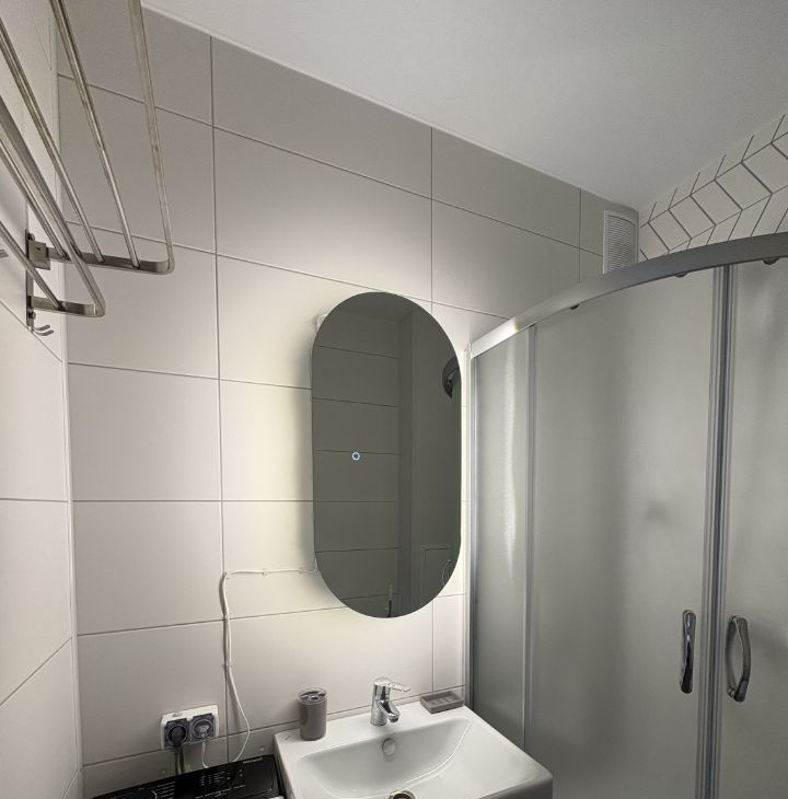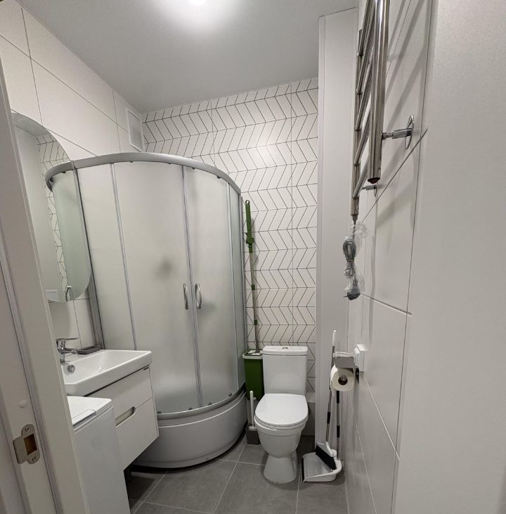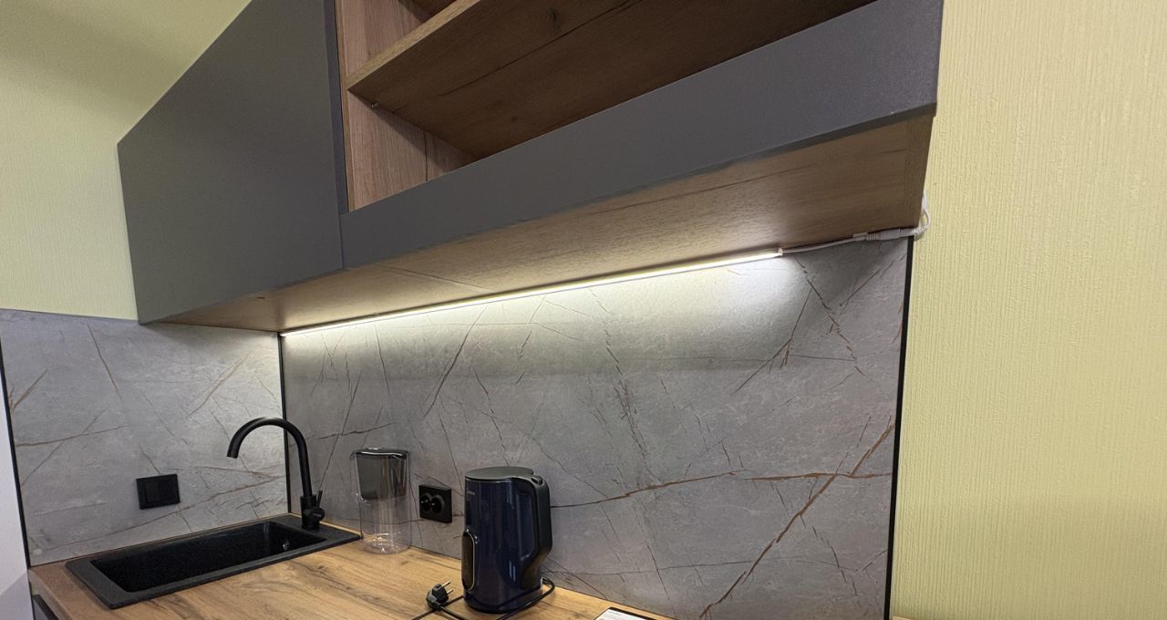 Имеется вся необходимая техника: холодильник, индукционная варочная панель, микроволновая печь, чайник, фильтр для воды, стиральная машина, пылесос, утюг, гладильная доска, сушилка для белья.