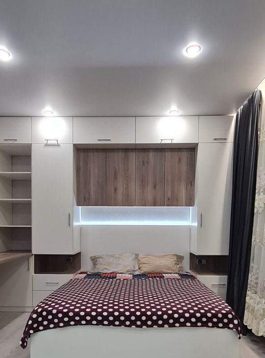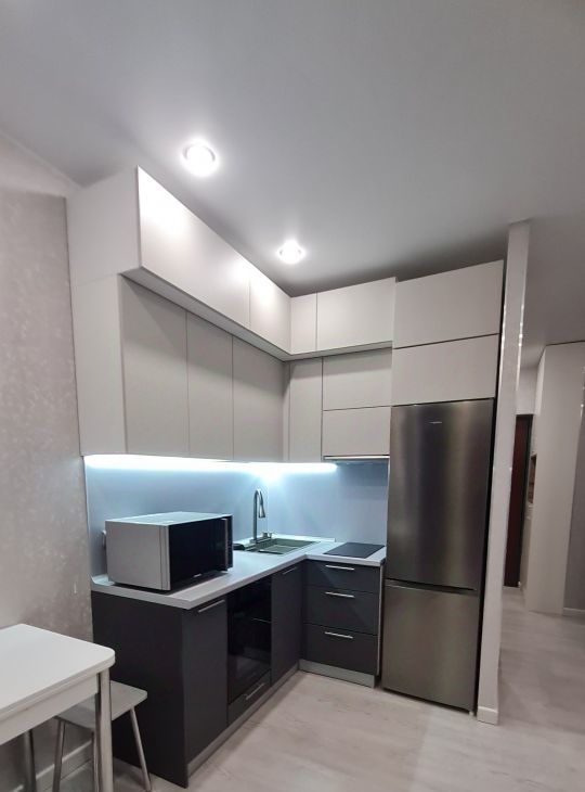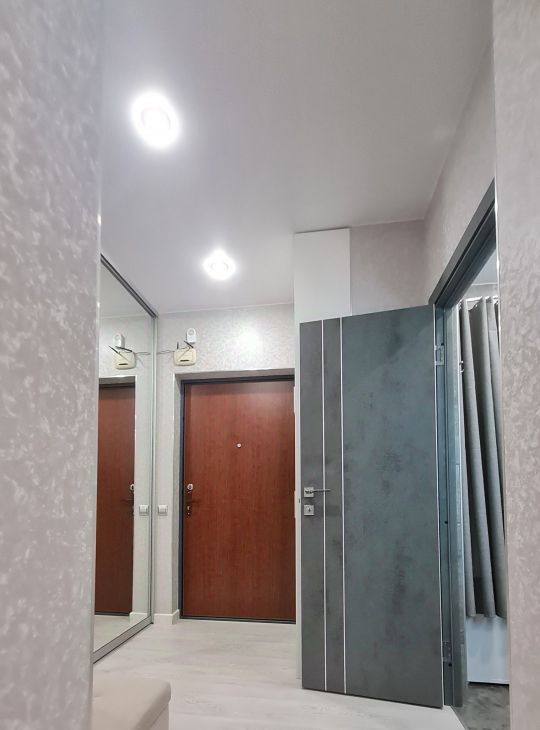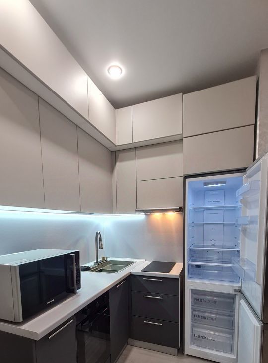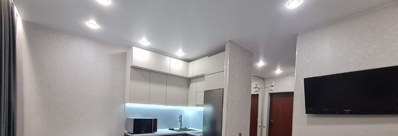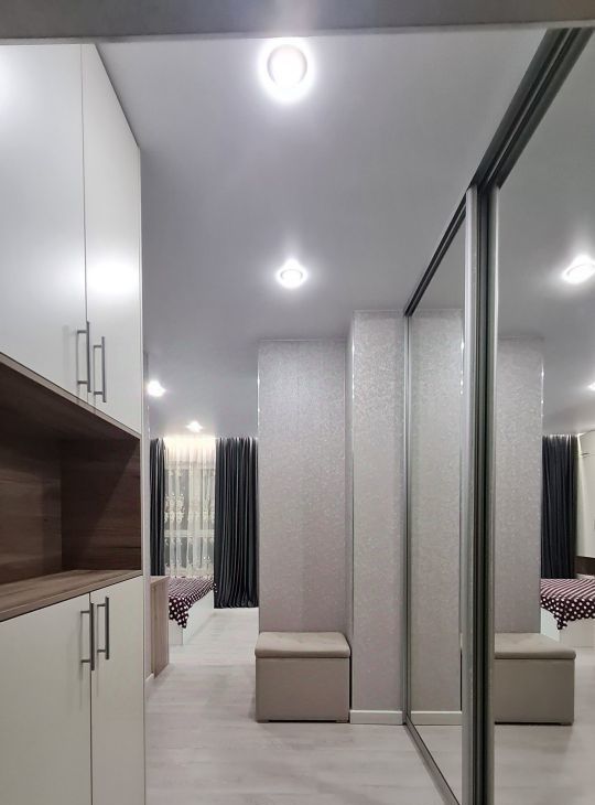 - В ремонте применены качественные материалы в современном серо-белом цвете. Всё освещение светодиодные светильники и состоит из разных сценариев света.