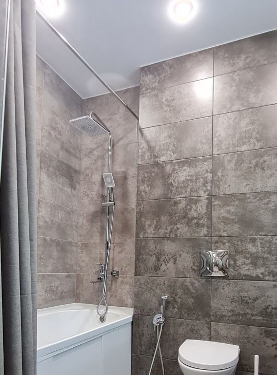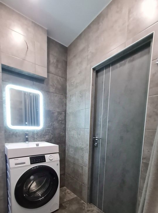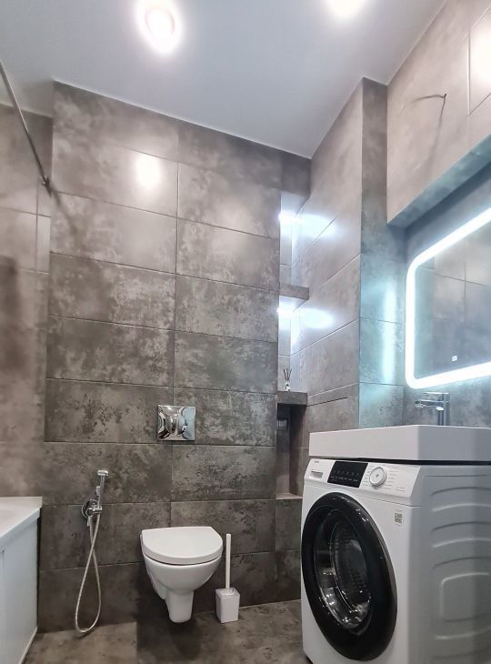 - Ванная комната очень просторная с длинной ванной для любителей полежать в воде! Установлен унитаз с инсталляцией и гигиеническим душем. Новая вместительная стиральная машина. Облицована серым керамогранитом с нишами с подсветкой.