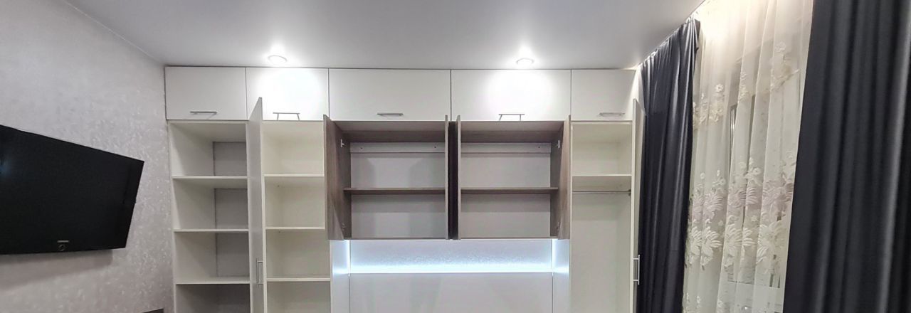 - Вся мебель изготовлена под заказ с множеством мест для хранения. Шкафы высотой под потолок.