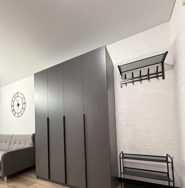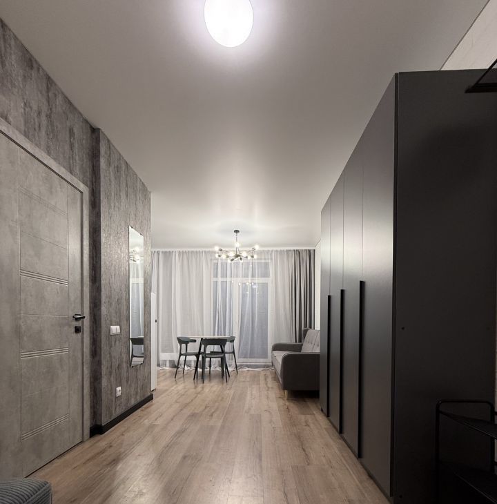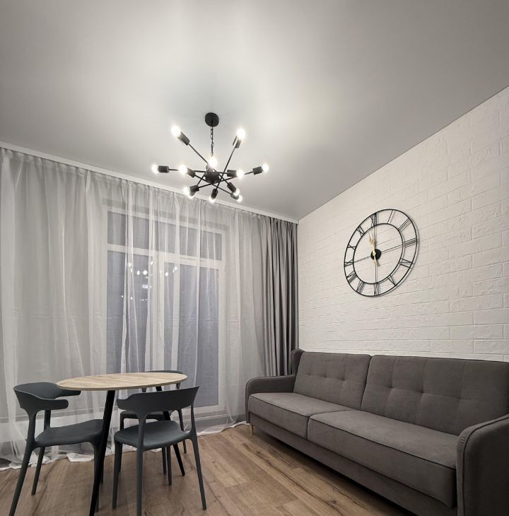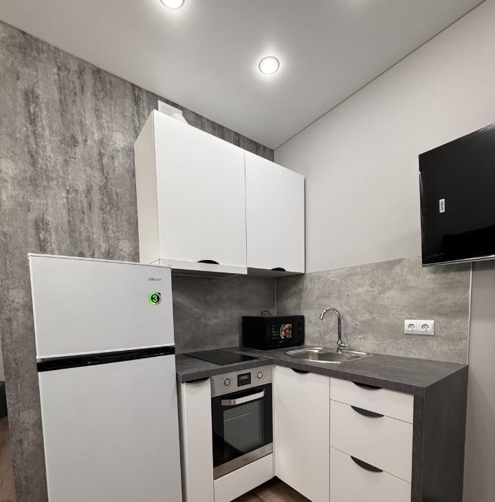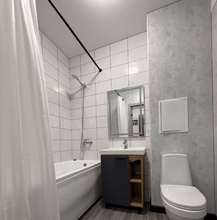 Студия оформлена в дизайнерском стиле, что создает атмосферу уюта и комфорта. В квартире есть вся необходимая мебель как на кухне, так и в жилой зоне. Для вашего удобства установлены холодильник, телевизор и стиральная машина. В ванной комнате — полноценная ванна, где можно расслабиться после долгого дня.