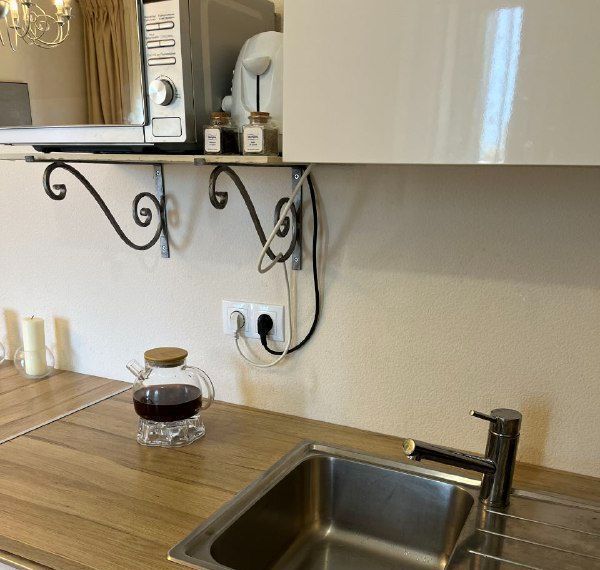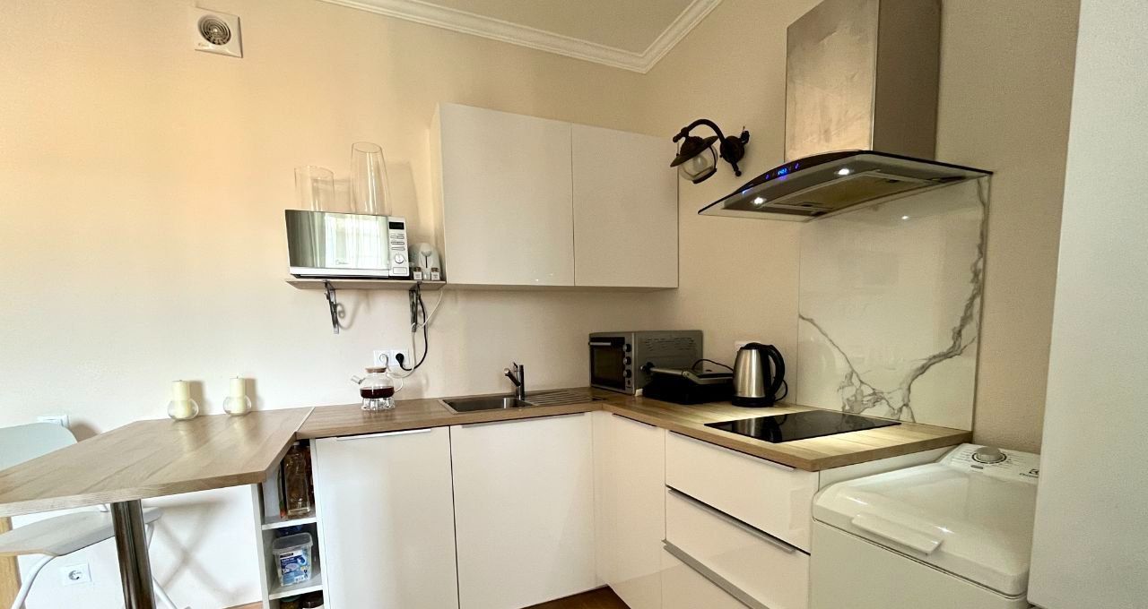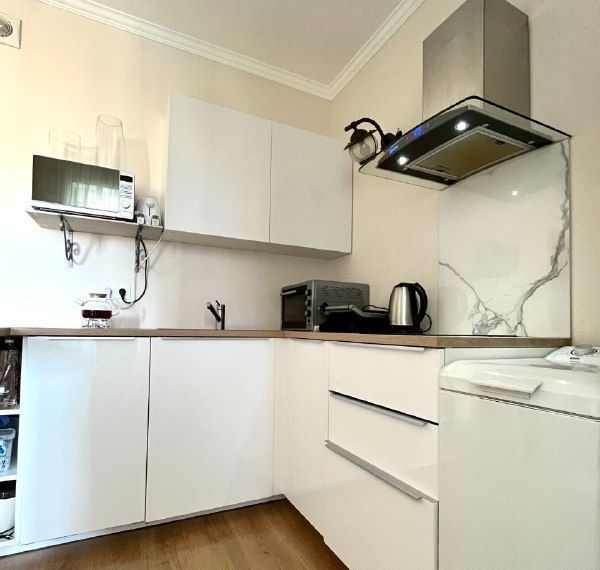 Техника: духовой шкаф, варочная плита, вытяжка, посудомойка, микроволновая печь, электрочайник, холодильник, стиральная машина.