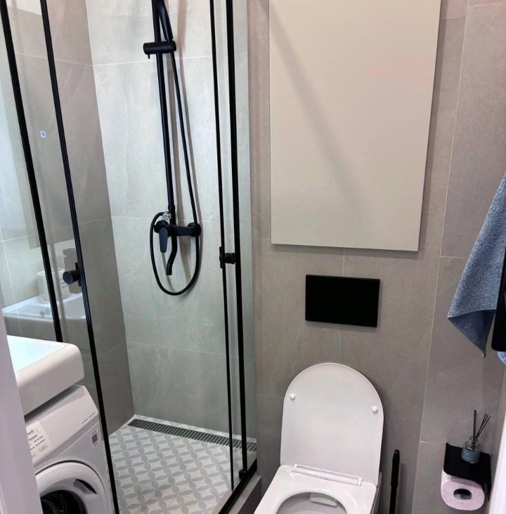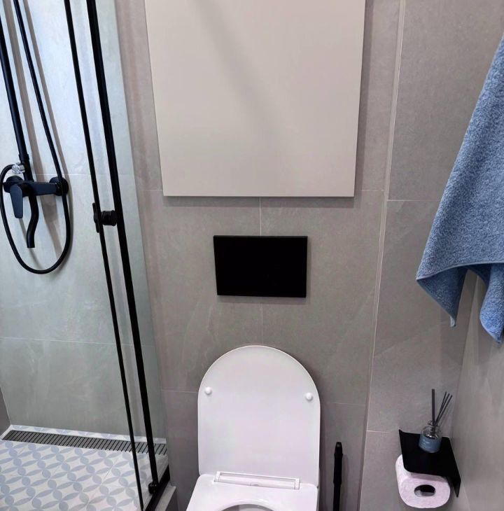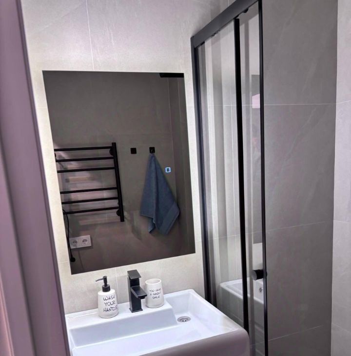 5. В ванной - керамогранит, зеркало со шкафчиком и подсветкой, полотенцесушитель;