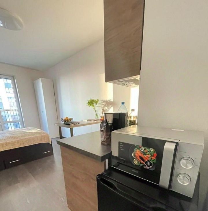 Кухонная зона: Полностью укомплектована необходимой техникой, включая варочную поверхность, вытяжку, микроволновую печь, холодильник, электрический чайник и кофеварку. Здесь вы сможете готовить любимые блюда с комфортом.