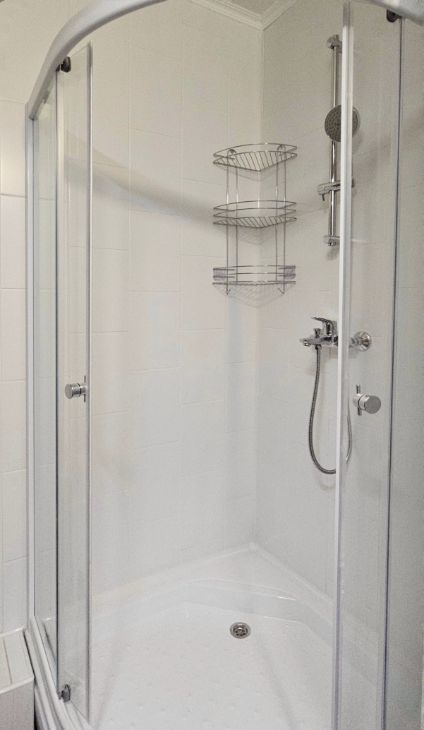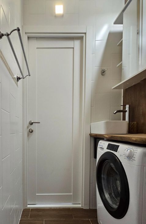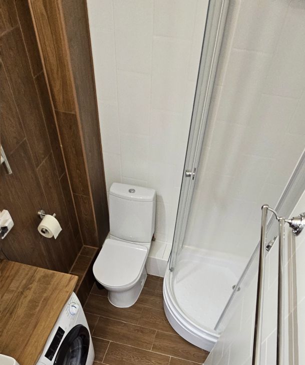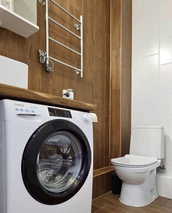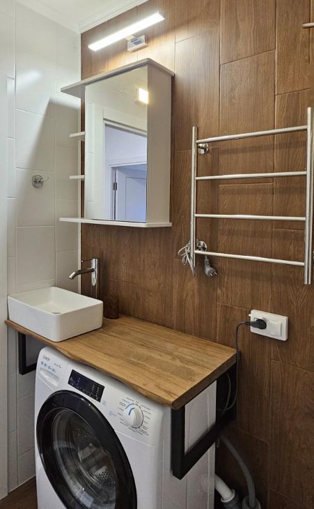 Ванная комната оборудована душевой кабиной с настенным душевым смесителем, керамической раковиной со столешницей из массива карагача и стиральной машинкой.