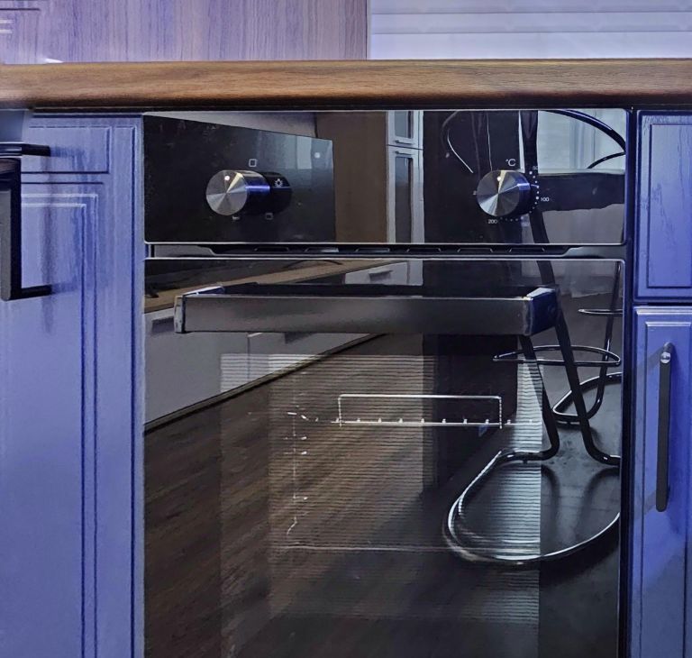 В выделенной обеденной зоне размещена барная стойка со стулья для вкусных приемов пищи.