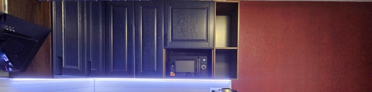 Кухонный гарнитур изготовлен по индивидуальному проекту, оборудован холодильником, посудомоечной машиной, вытяжкой, варочной панелью, духовым шкафом, микроволновой печью, чайником.