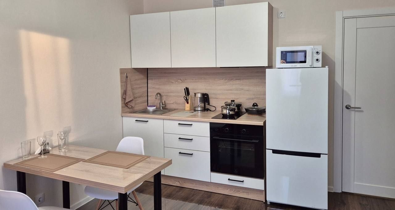 - Всё необходимое для комфортного проживания. Новый раскладной диван, кухонный гарнитур, плита, холодильник, вытяжка, микроволновая печь, полный набор посуды и столовых приборов. Для быта есть утюг, гладильная доска и сушилка для белья.