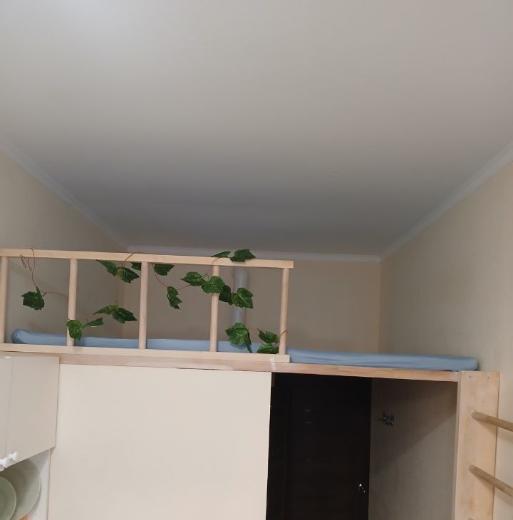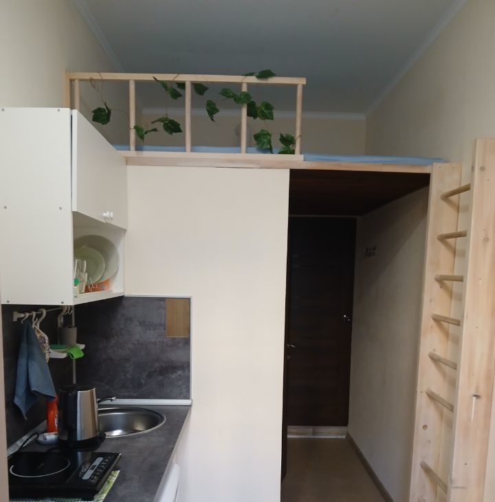 В студии есть все необходимое для проживания, полноценное спальное место находится на втором уровне.