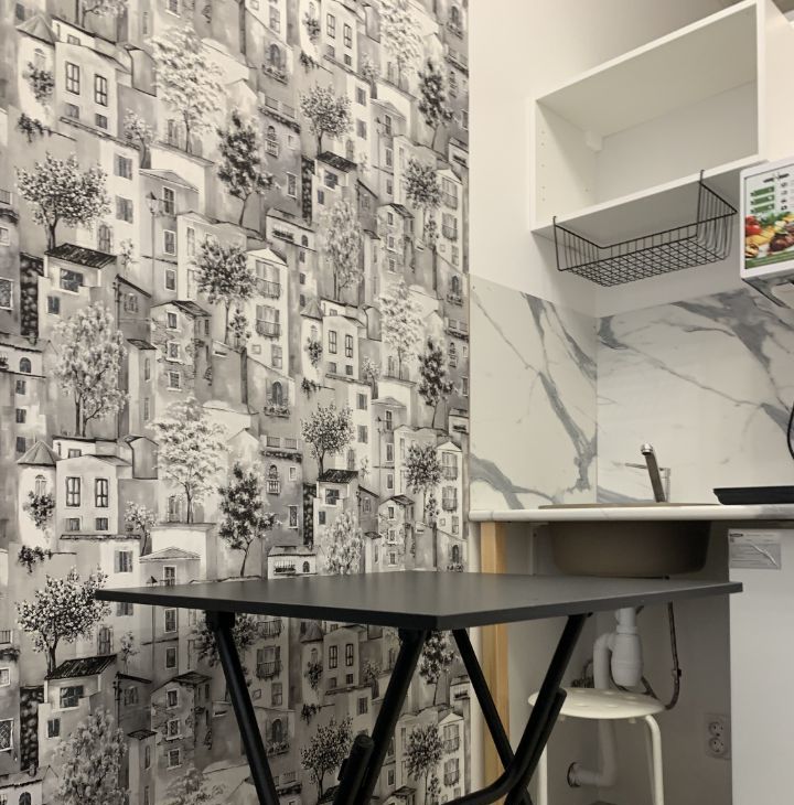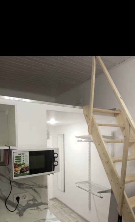 В студиии индукция плита, микроволновка, стиральная машина общая, одно спальное место, места хранения одежды.
