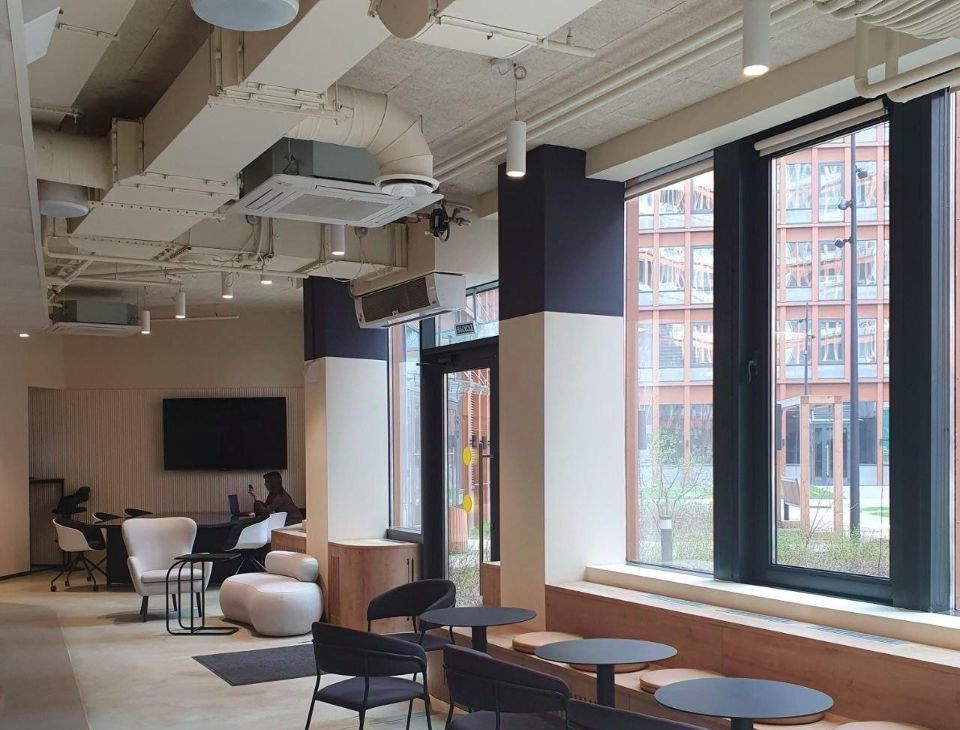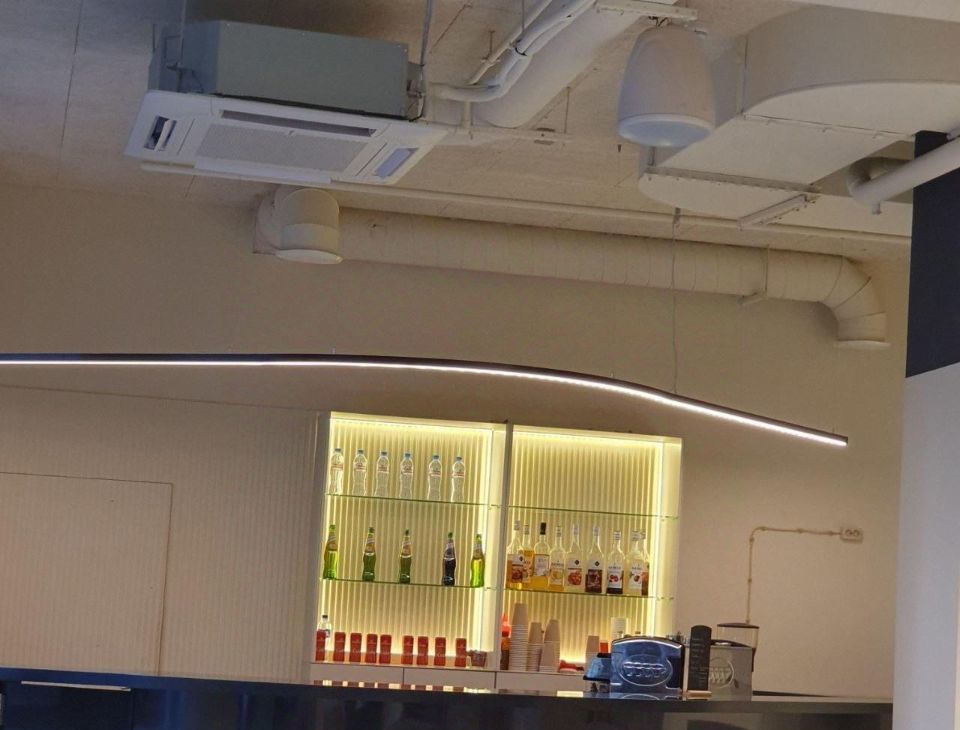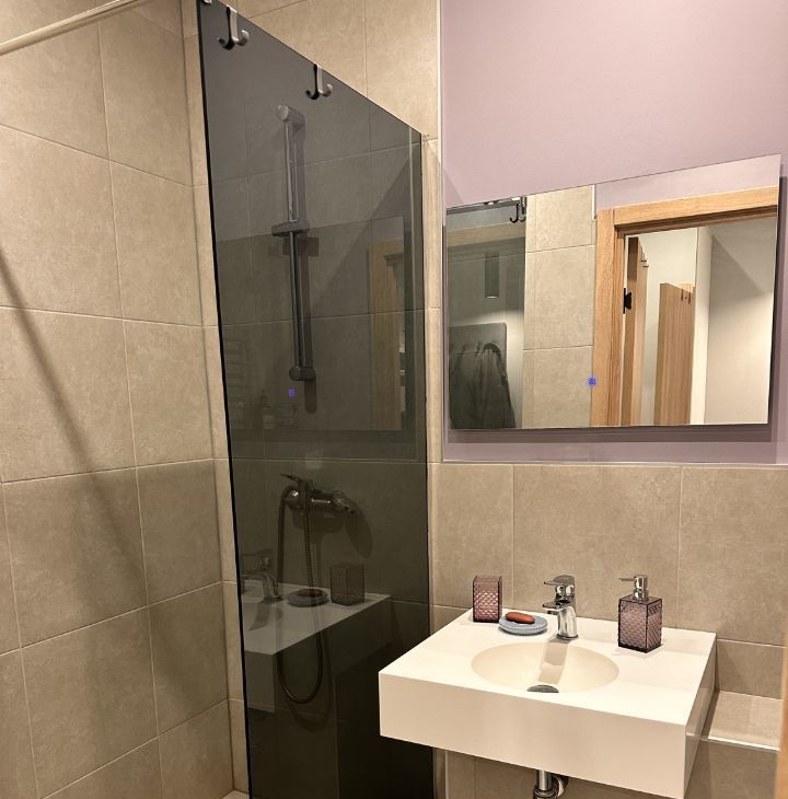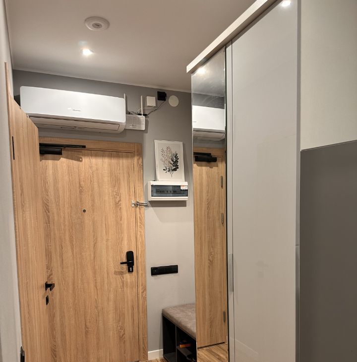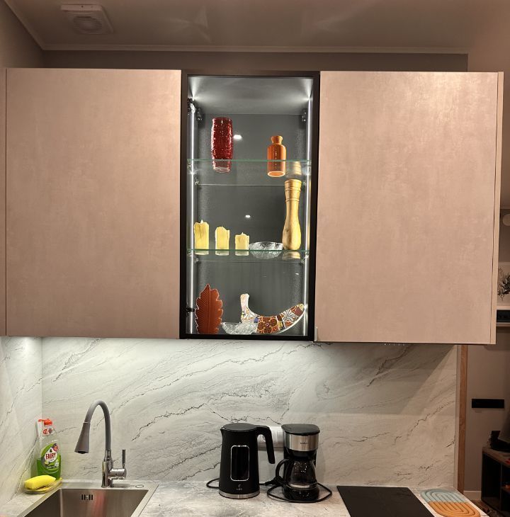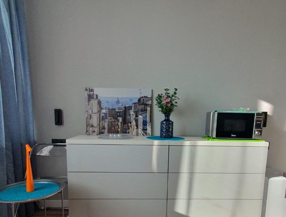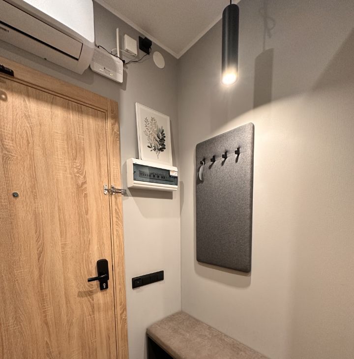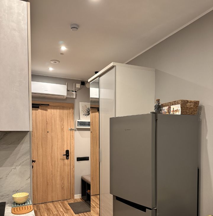 Посудомойка, микроволновка и полноценный большой холодильник с отдельной морозилкой, чайник, капельная кофемашина, кондиционер, ТВ, рабочий стол и диван с ортопедическим матрасом.