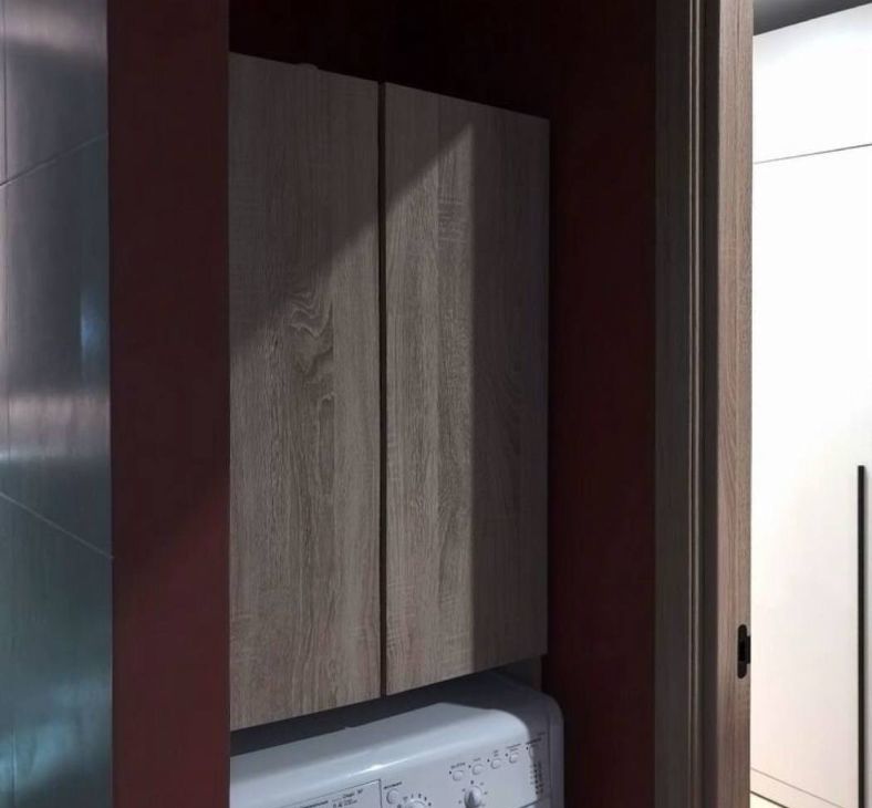 Встроенный кухонный гарнитур. Есть варочная панель, микроволновка, холодильник.