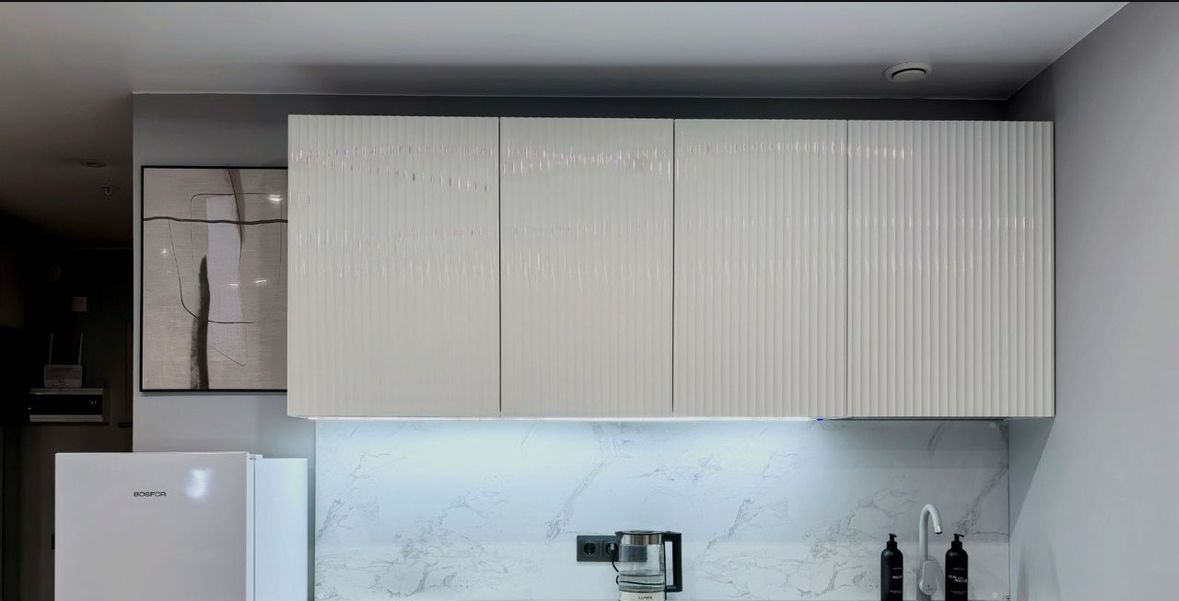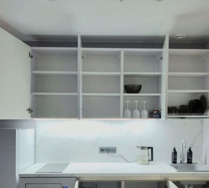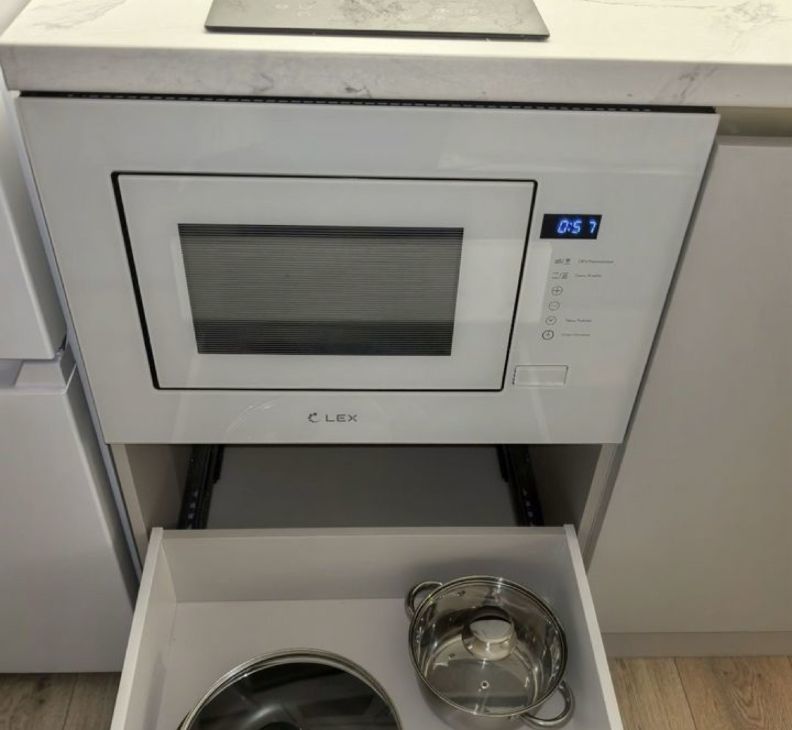 Встроенный кухонный гарнитур. Есть варочная панель, микроволновка, холодильник.