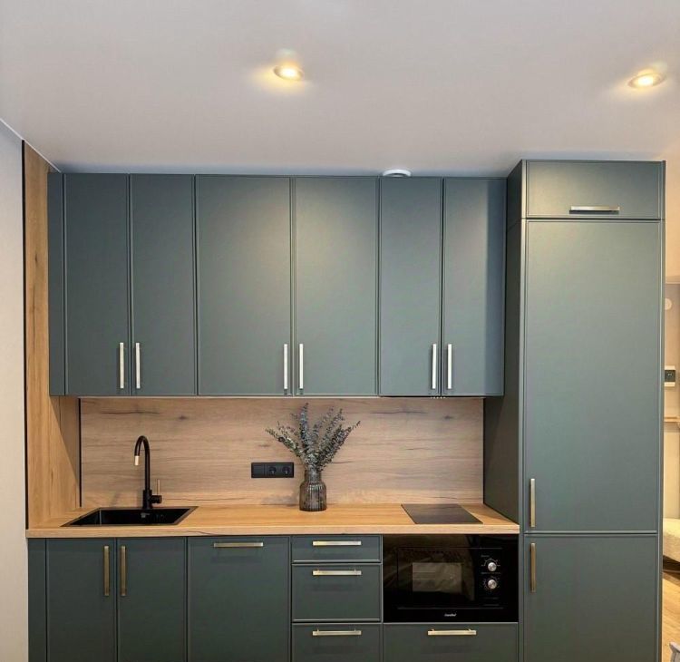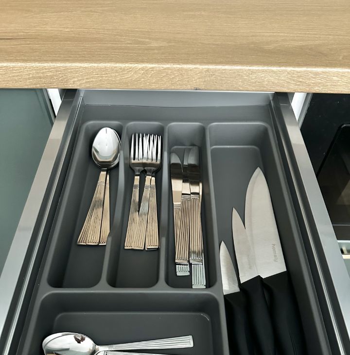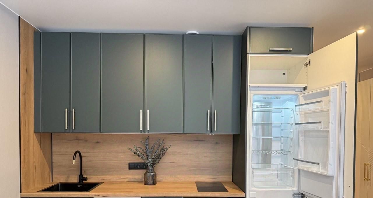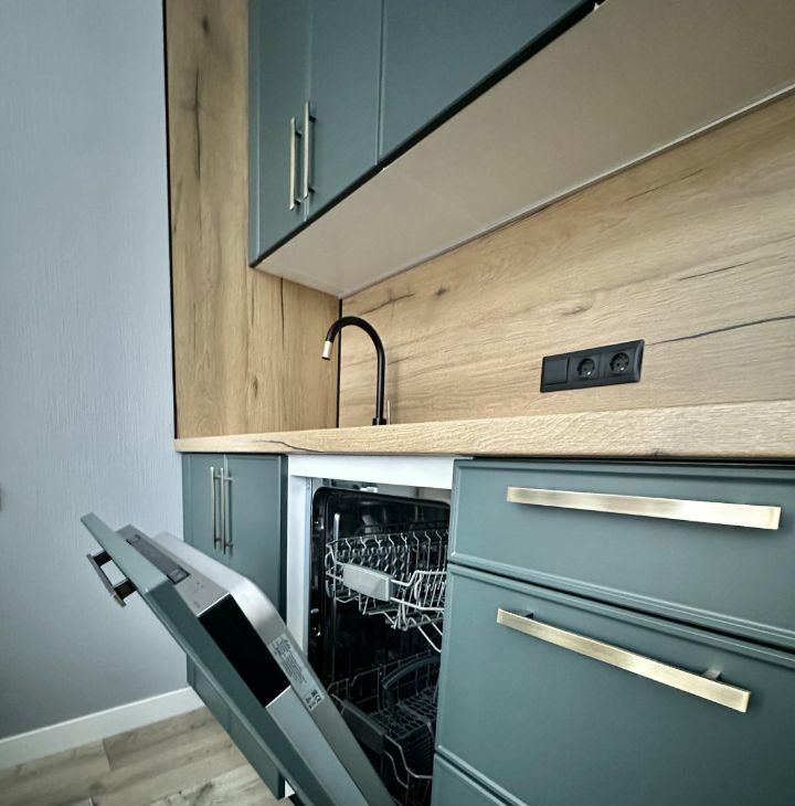 Потрясающая кухня укомплектована новой встроенной техникой: варочная поверхность, полноценный холодильник, микроволновая печь,посудомоечная машина, вытяжка. Есть посуда и столовые приборы.