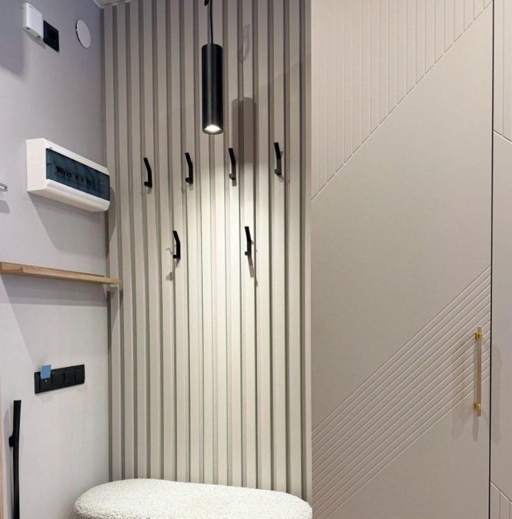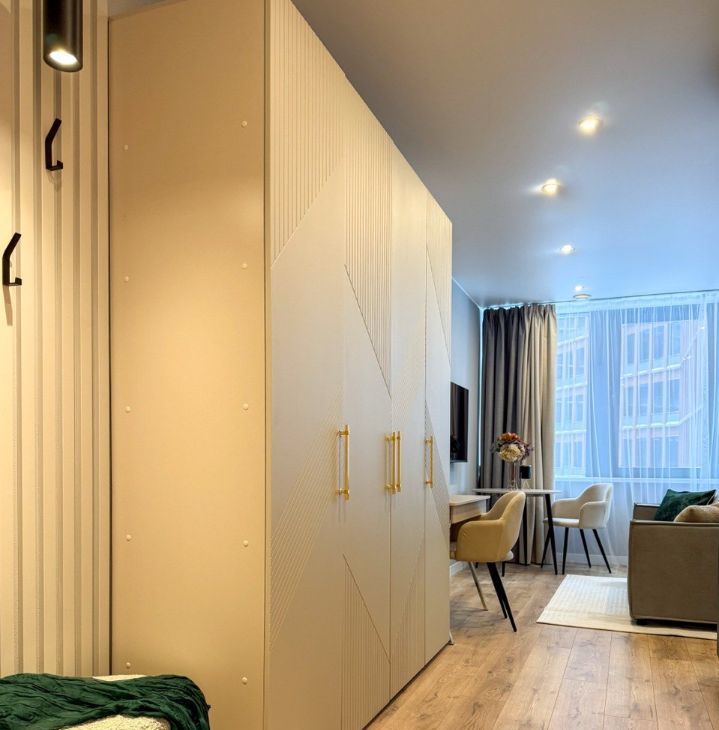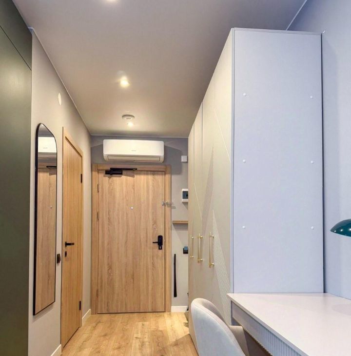 Продуманы места хранения: большой шкаф для одежды, ящики для хранения белья - в кровати с подъемным механизмом, а также возле входа располагается компактная открытая вешалка.