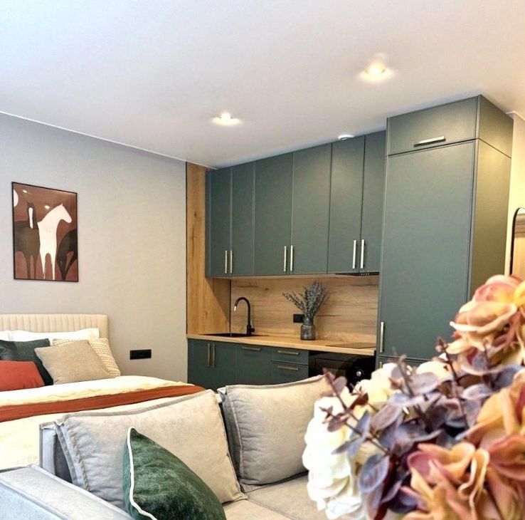 Пространство разделено на зону гостиной (с диваном) и зону спальни (с полноценной кроватью 160*200)