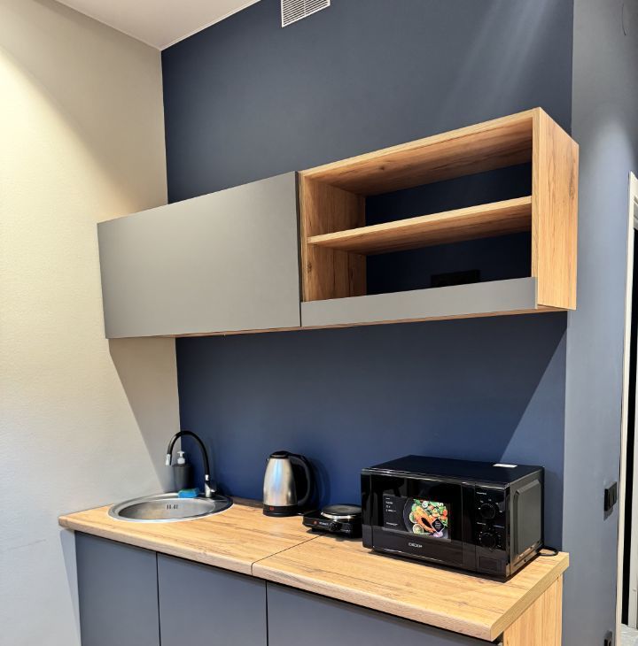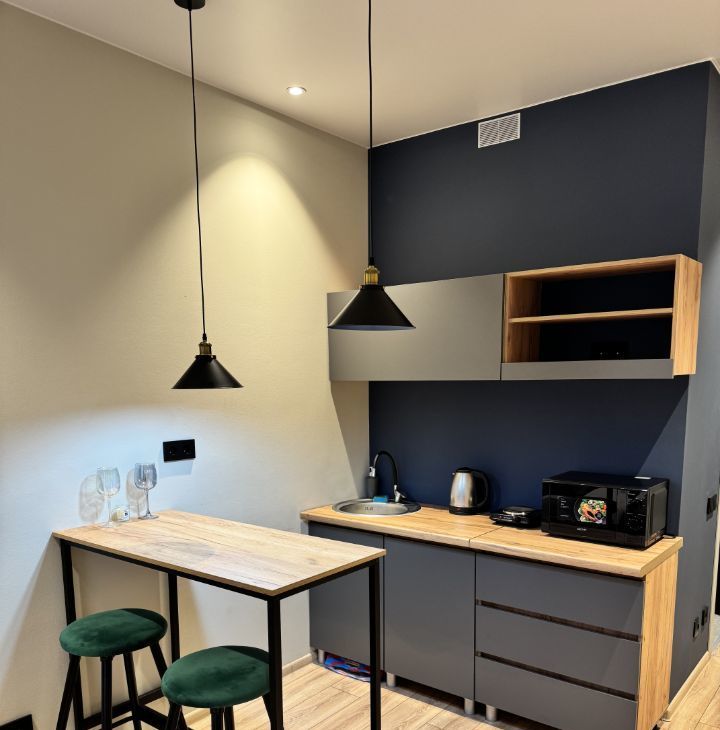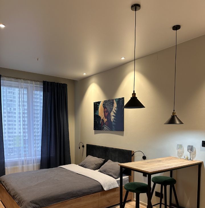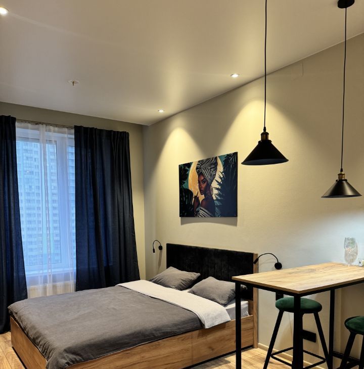 Студия выполнена в современном стиле с качественным евроремонтом. В комнате и на кухне есть вся необходимая мебель для комфортного проживания.
