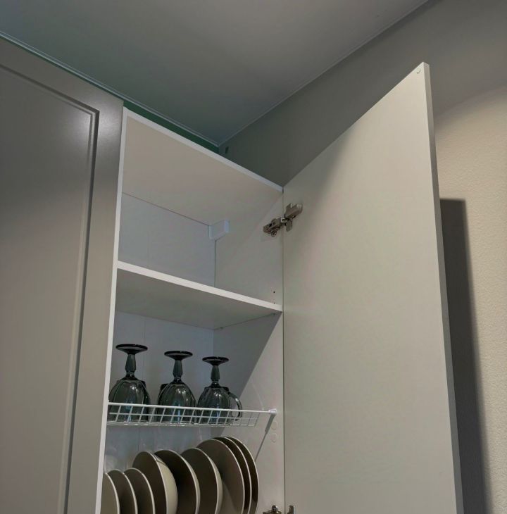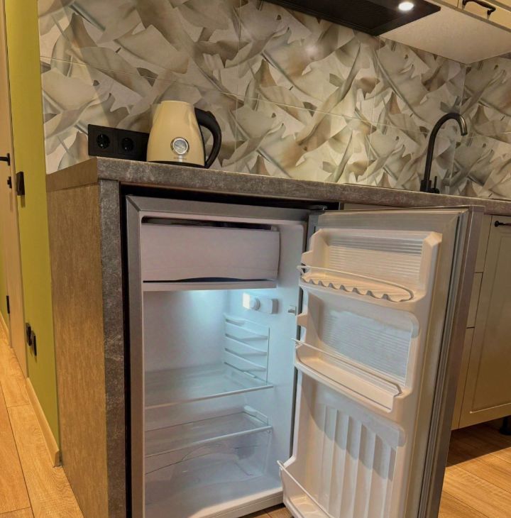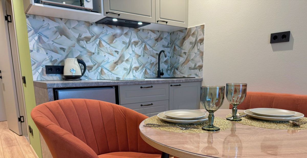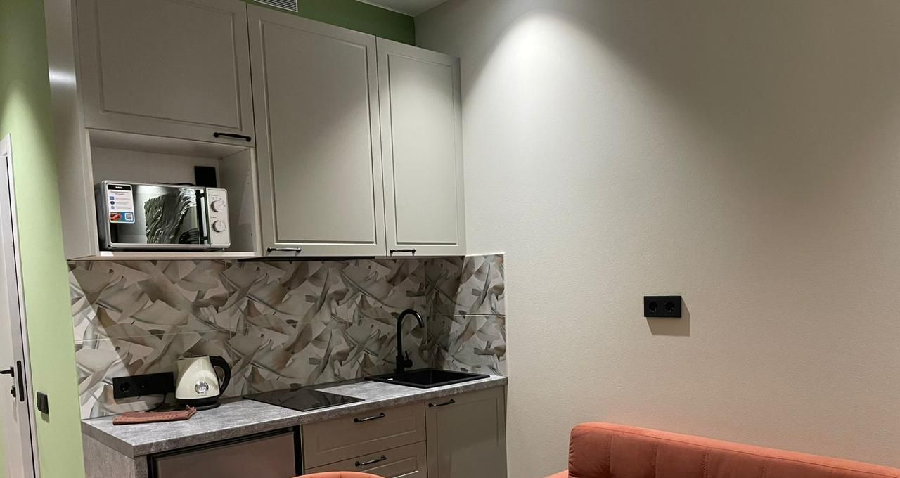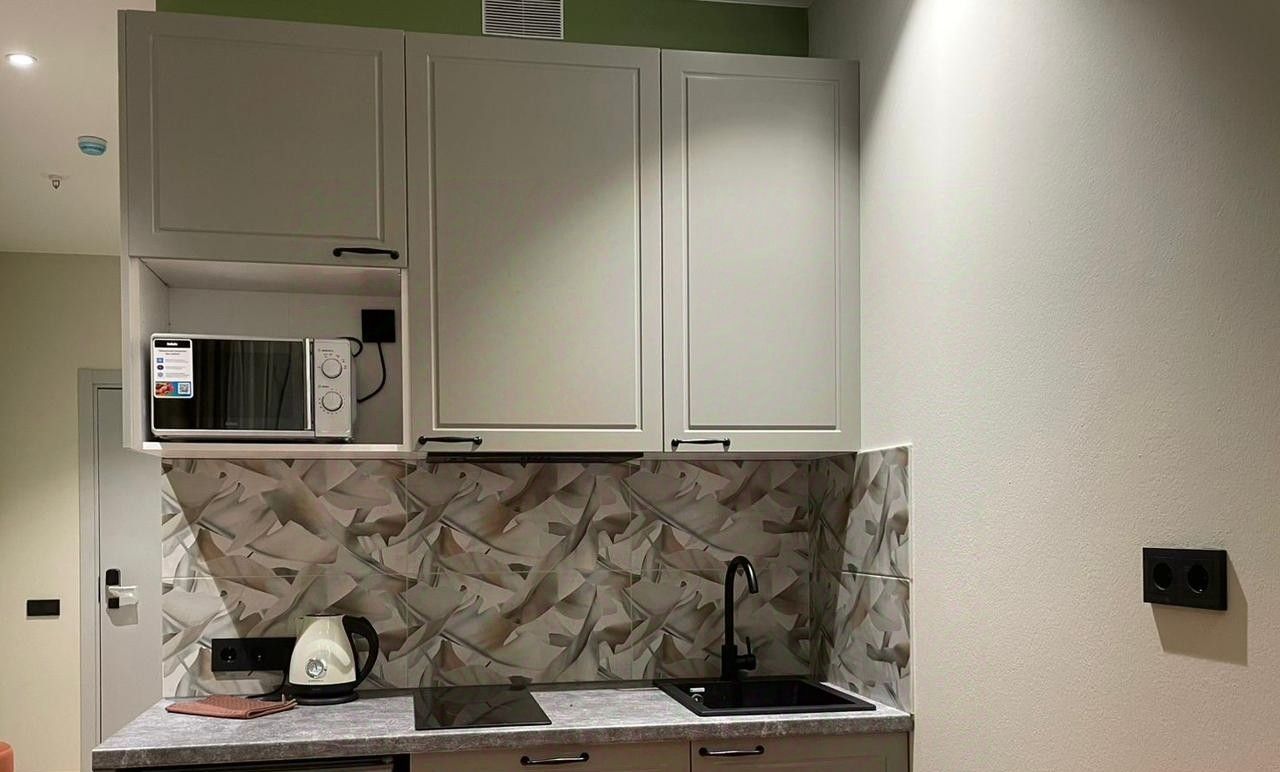 - Оборудованная кухонная зона: кухонный гарнитур, микроволновка, чайник, кран с фильтром, плита, а также вся необходимая посуда.