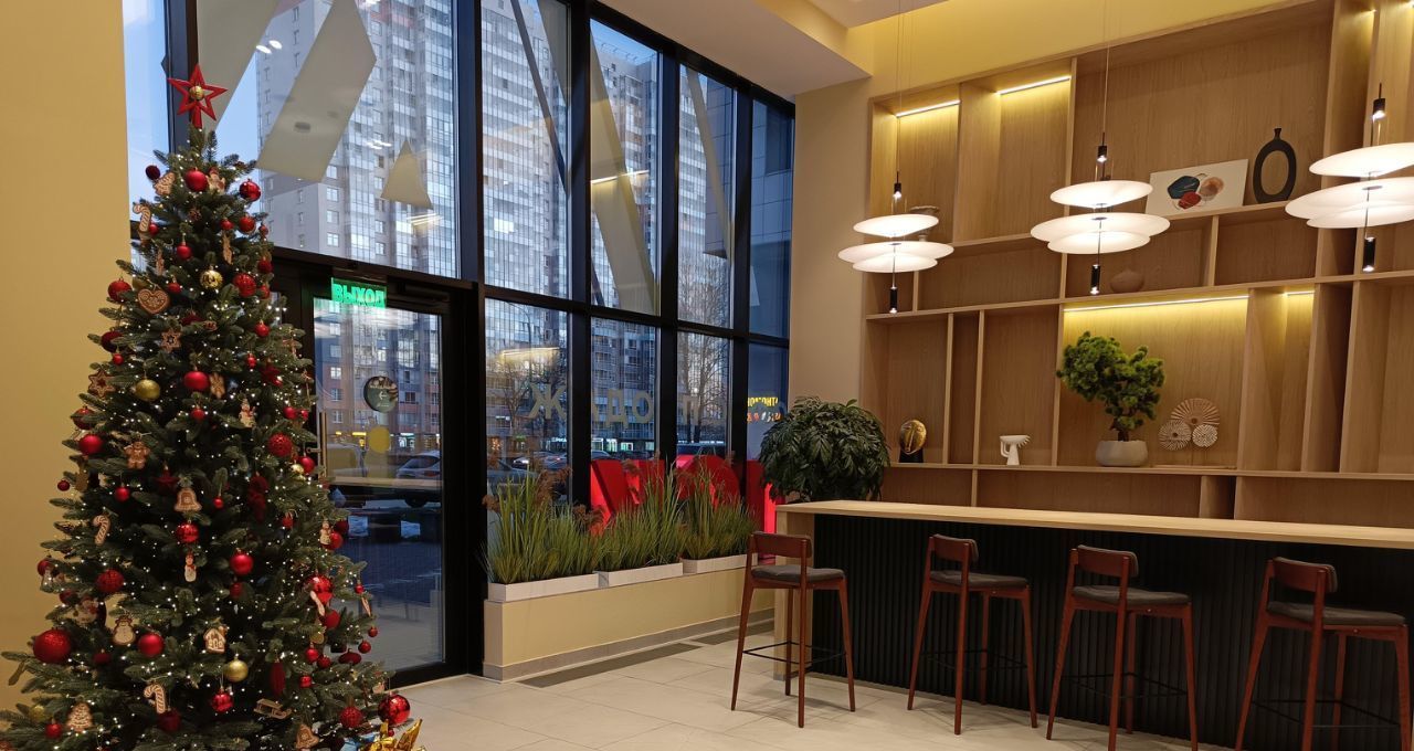 На первом этаже есть прекрасная зона с рабочими и посадочными местами. На территории и внутри дома ведется большой контроль чистоты, работает ресепшен 24/7. Везде ведется видеонаблюдение.