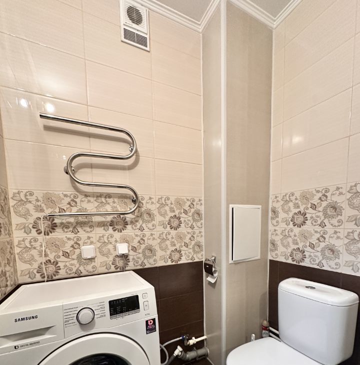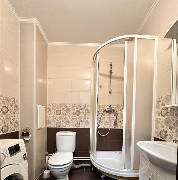 В совмещенном санузле установлена стиральная машинка.