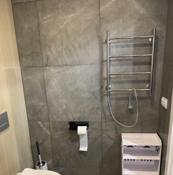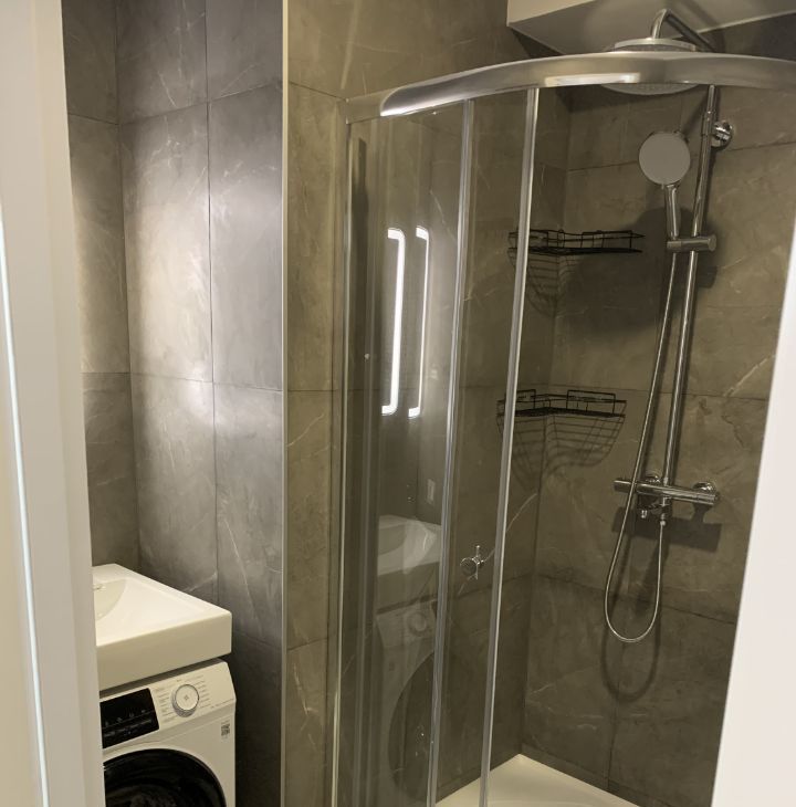 Совмещённый, просторный санузел. В санузле теплый пол, душевая кабинка, стиральная машинка.