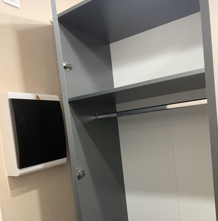 Визуально отделена зона отдыха. В ней находится диван-кровать разбирается в полноценное спальное место. Шторы блэкаут. Достаточно места для хранения: вместительный шкаф и комод. Над комодом телевизор. Интернет проведен.