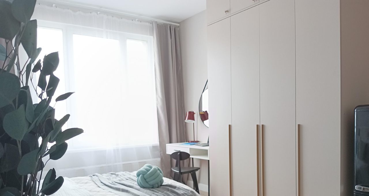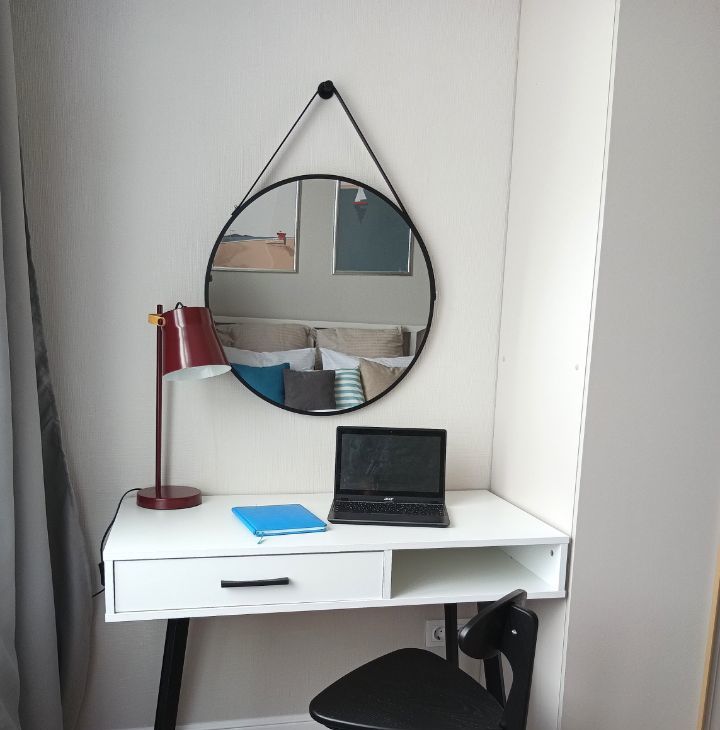 Вся необходимая мебель: большая кровать с ортопедическим матрасом, много мест для хранения вещей, компьютерный / туалетный стол