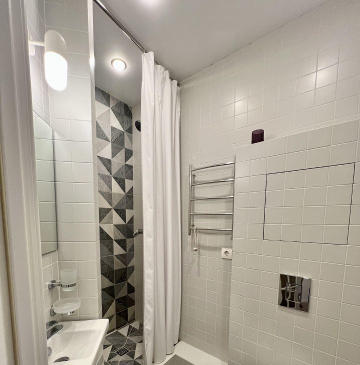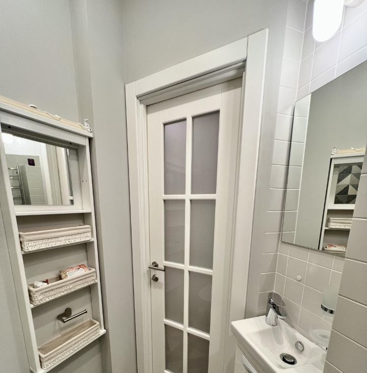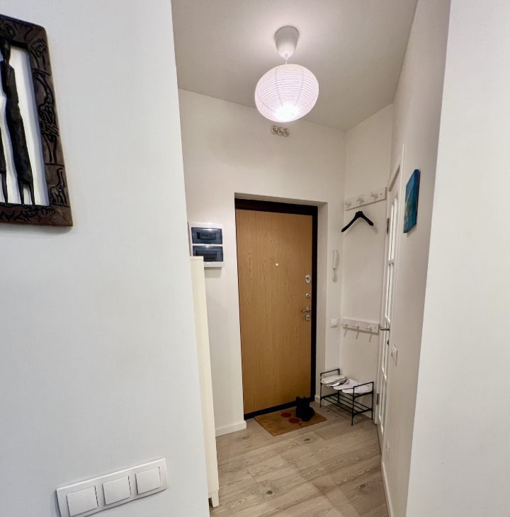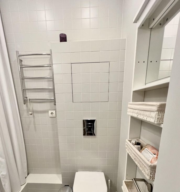 Квартира оборудована всем необходимым для комфортного проживания. Пол отделан натуральной инженерной доской с деревянными плинтусами, в зоне прихожей под плиткой проходит труба отопления, создавая естественный эффект теплого пола. В санузле установлена качественная сантехника Jacob lafont.