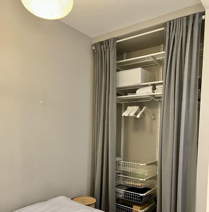 - за шторой - вместительная гардеробная с рейтингами и полками,
