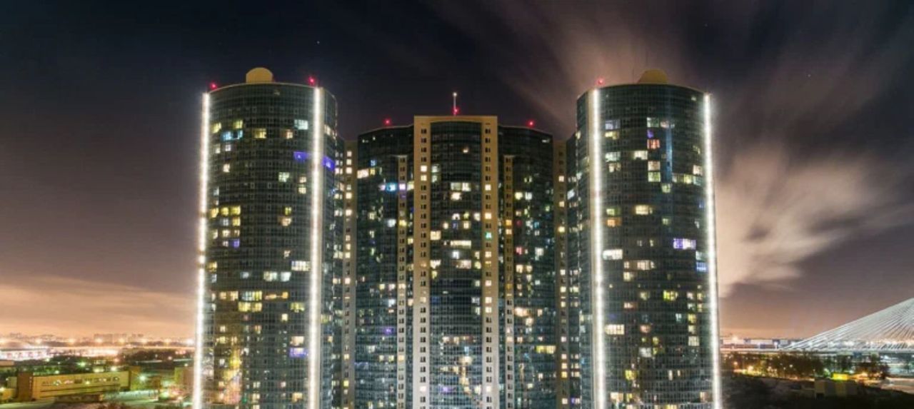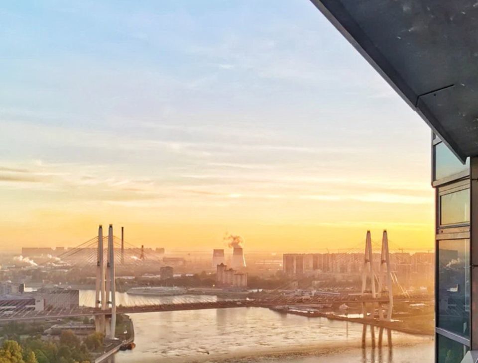 ЖК "Александр Невский" - самый высокий жилой дом Санкт-Петербурга (35 этажей). Из окон квартиры открываются потрясающие панорамные виды на Неву и окрестности. С балкона лестничной клетки виден почти весь город.