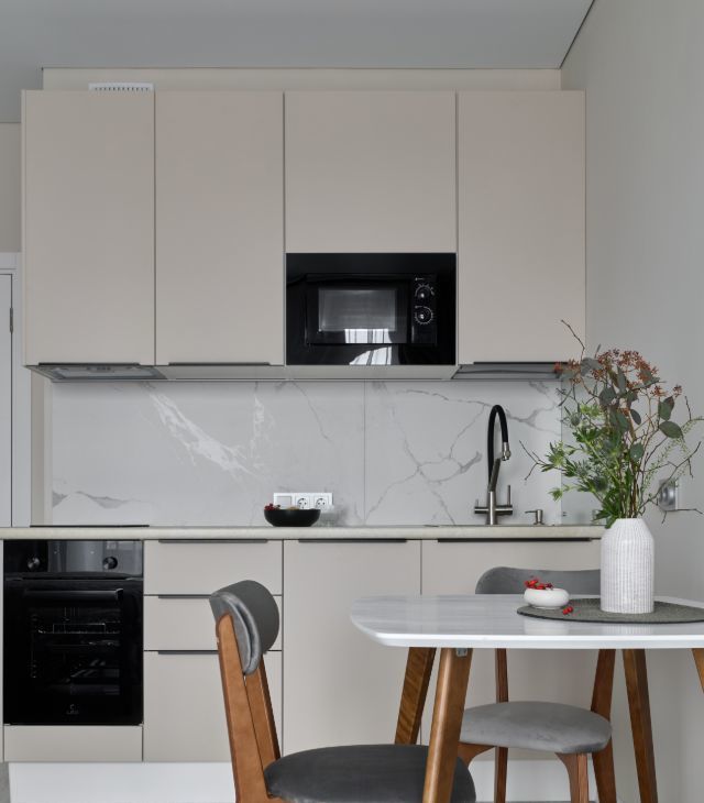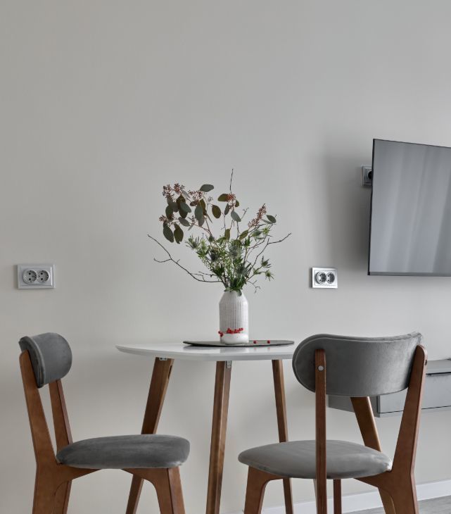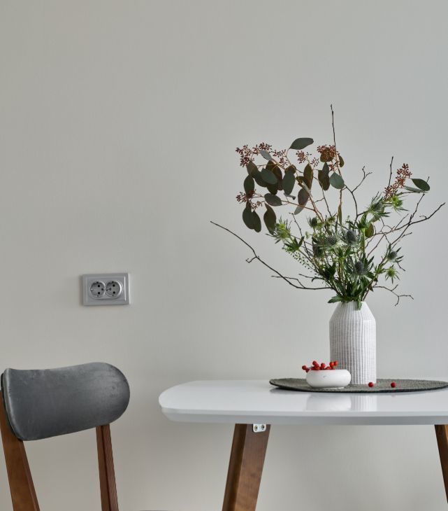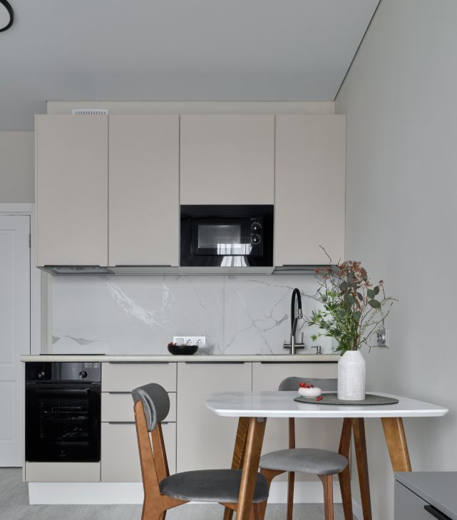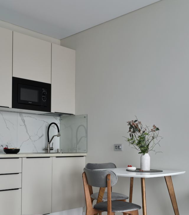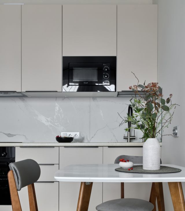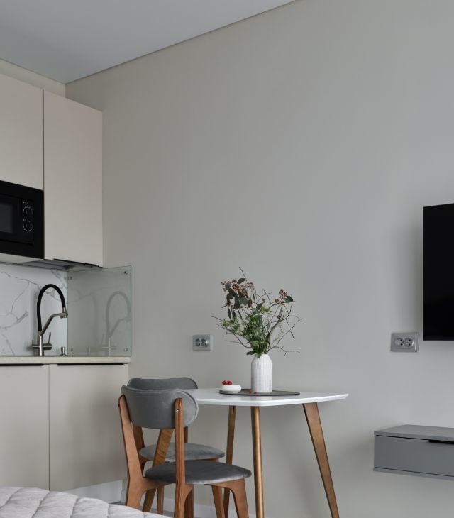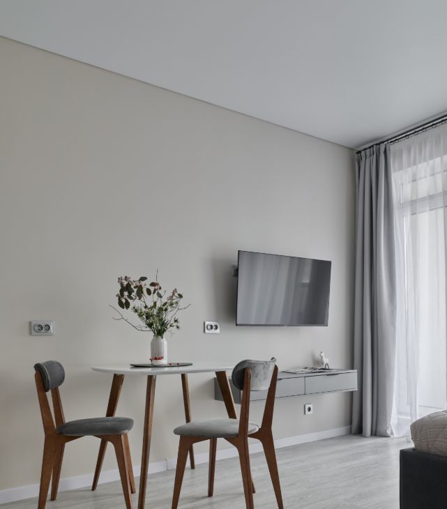 Интерьер светлый, уютный, с атмосферой комфорта и вкуса. Красивое пространство, где приятно жить и работать.