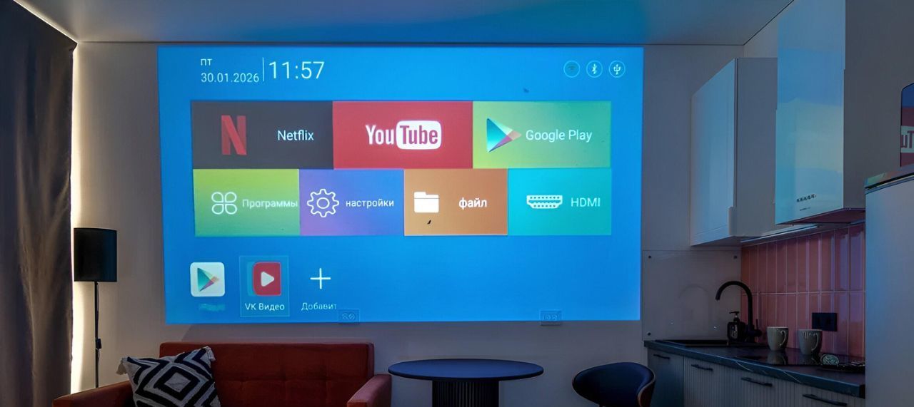Подключен wi-fi и телевидение, установлен проектор - можете менять место просмотра на свой вкус.