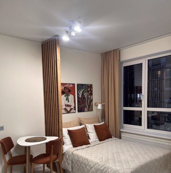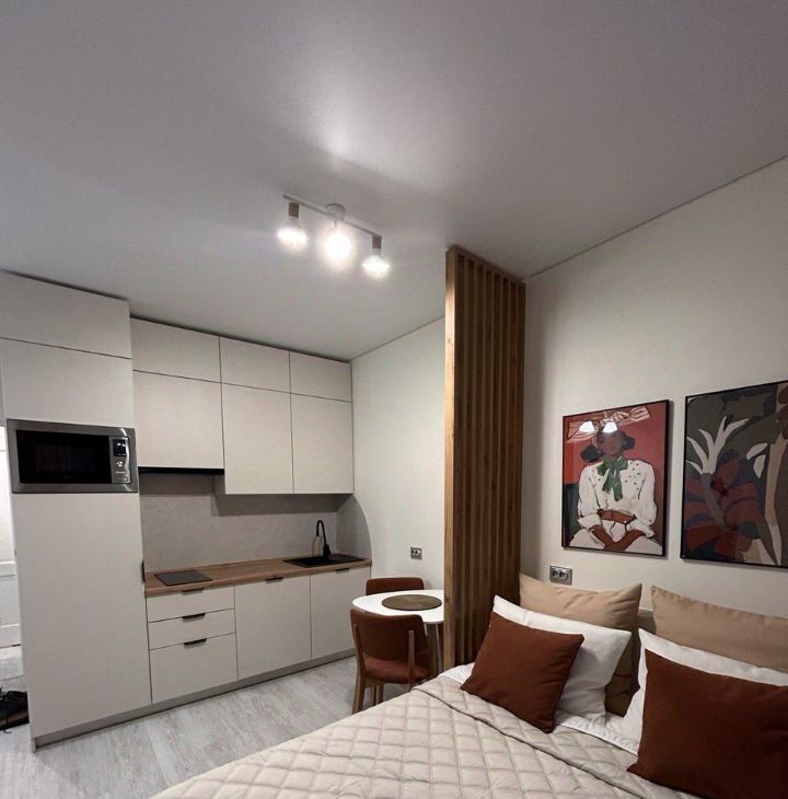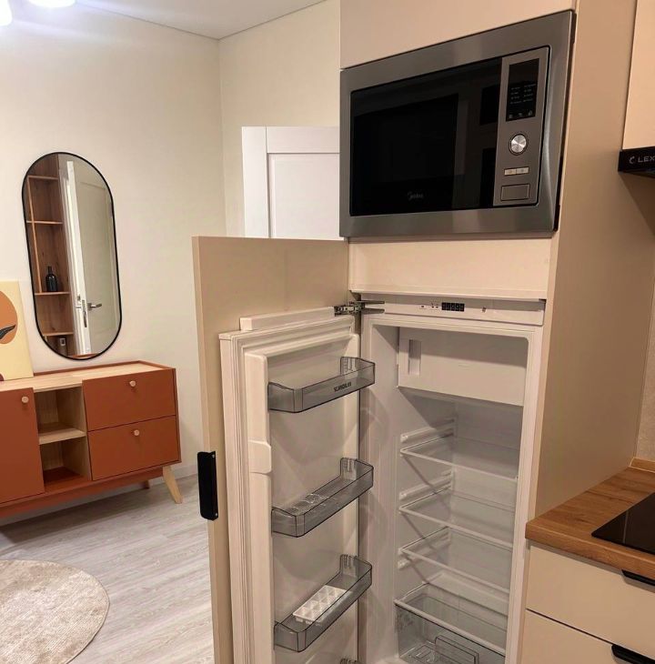 Есть всё необходимое для комфортной жизни — встроенная кухня, варочная панель, холодильник, стиральная машина, удобная кровать, места для хранения.