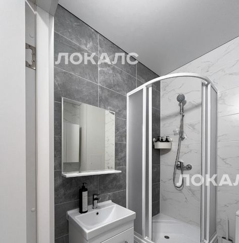 Студия полностью меблирована. В комнате раскладной диван, размер спального места 140х200см. В наличии вся необходимая техника: холодильник, посудомоечная и стиральная машины, духовой шкаф, варочная панель, вытяжка. Совмещённый санузел оборудован душевой кабиной, также есть умывальник с подвесной тумбой и зеркалом, шкафчик для хранения и прочие мелкие удобства.