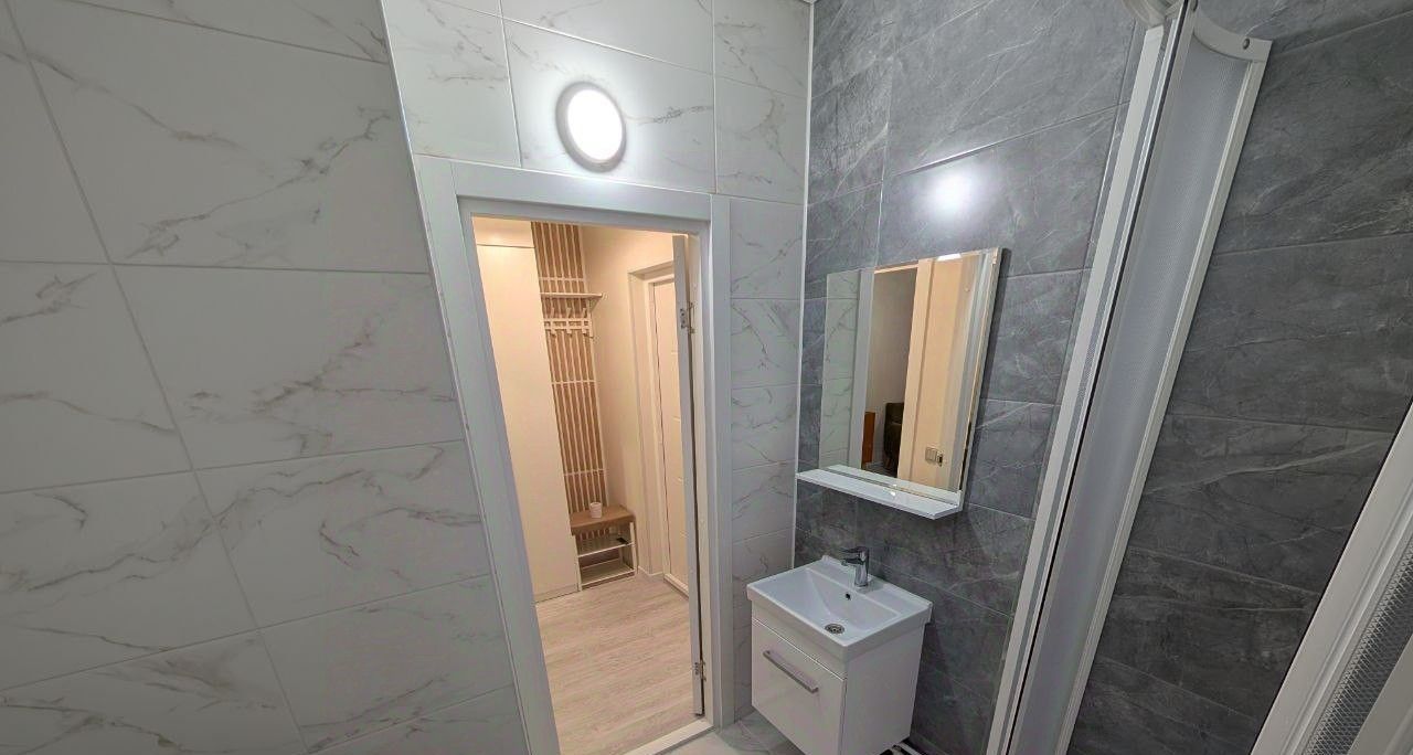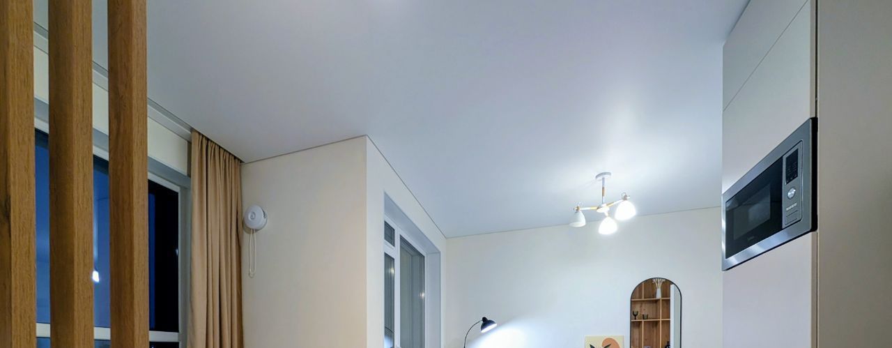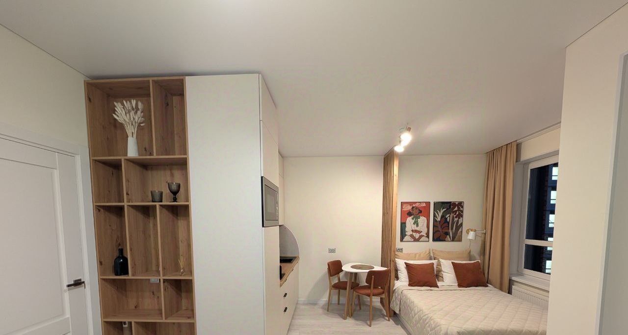 Есть всё необходимое для комфортной жизни — встроенная кухня, варочная панель, холодильник, стиральная машина, удобная кровать, места для хранения.