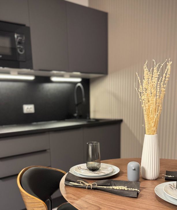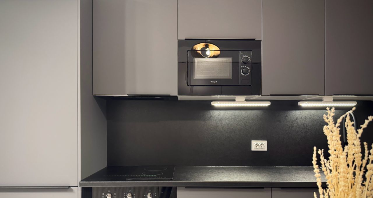 - Современная встроенная кухня (Варочная Панель, Духовой шкаф, Встроенная СВЧ, Посудомоечная машина, Встроенный Холодильник, Встроенная Вытяжка.