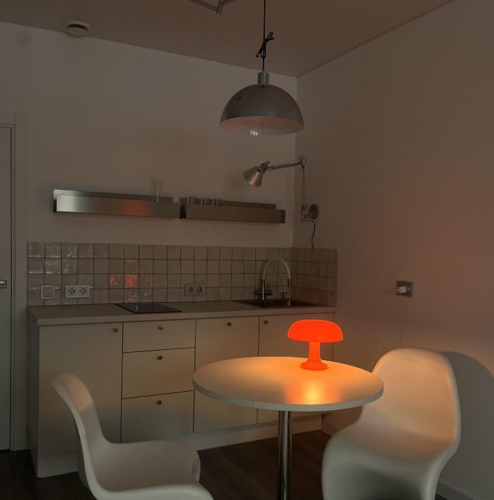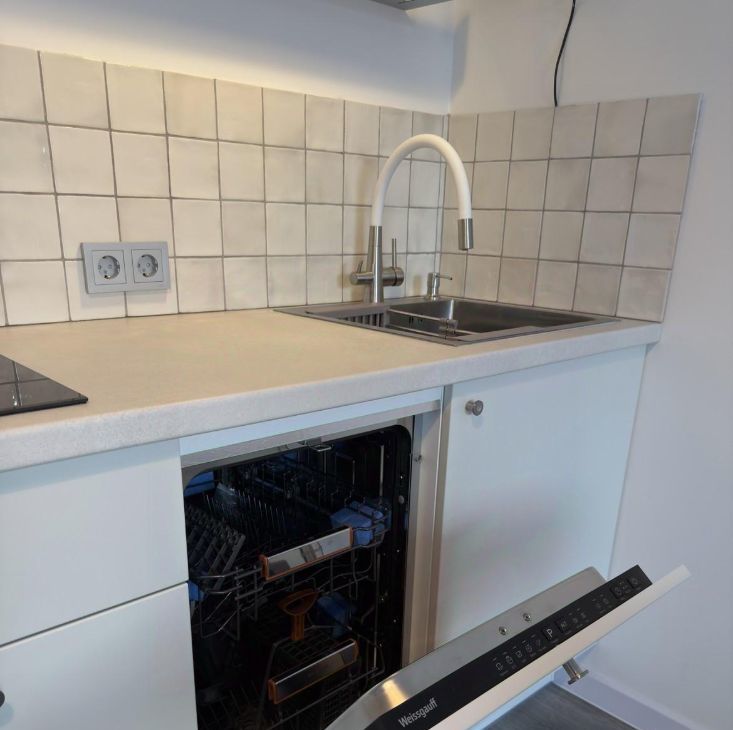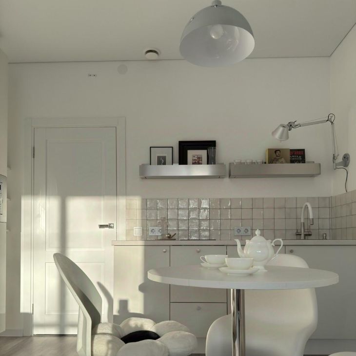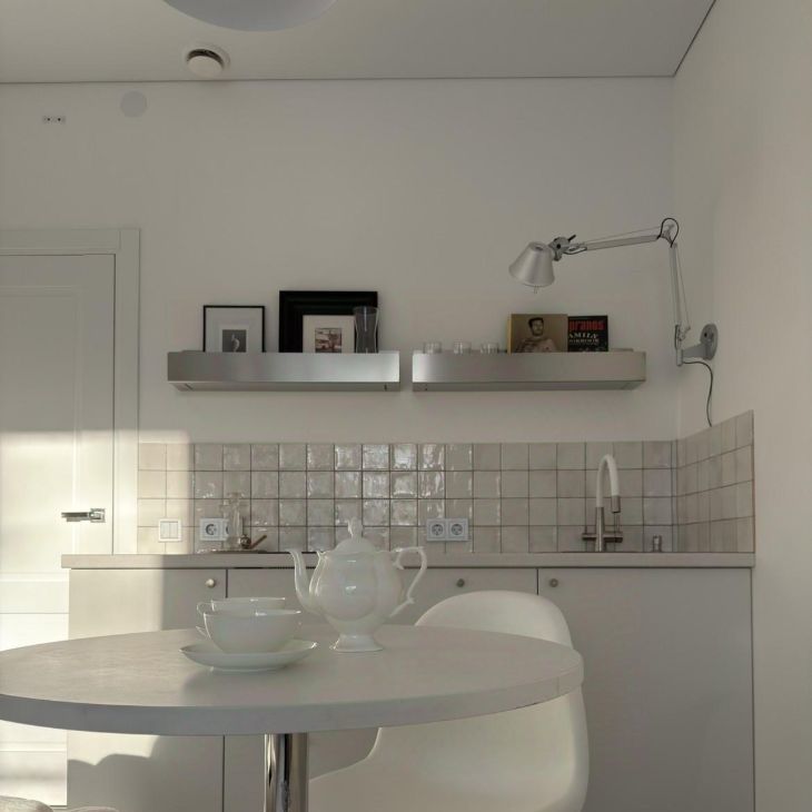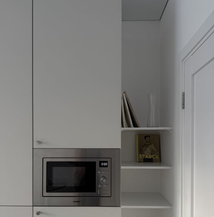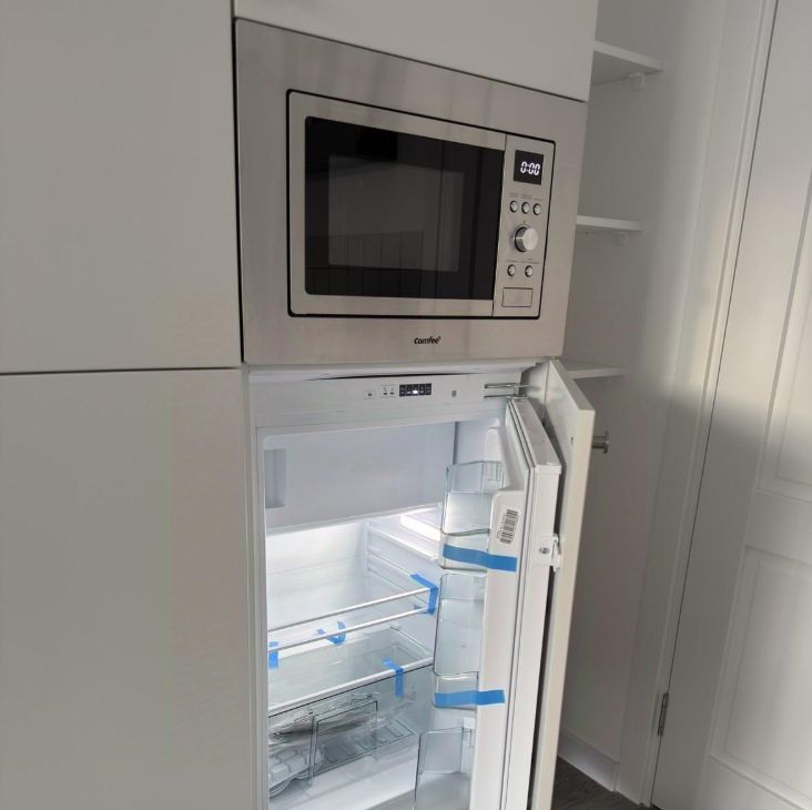 Вся необходимая техника: варочная панель, встроенный холодильник, микроволновка, чайник. Много места для хранения.