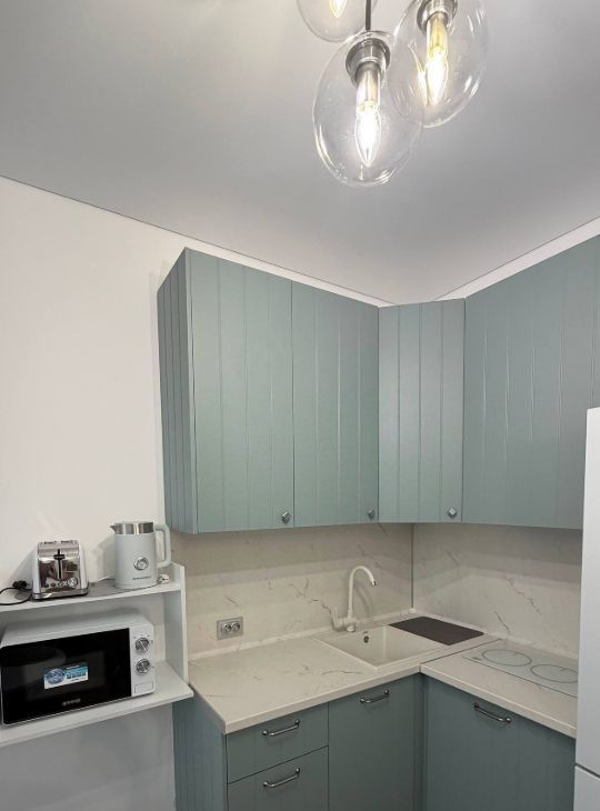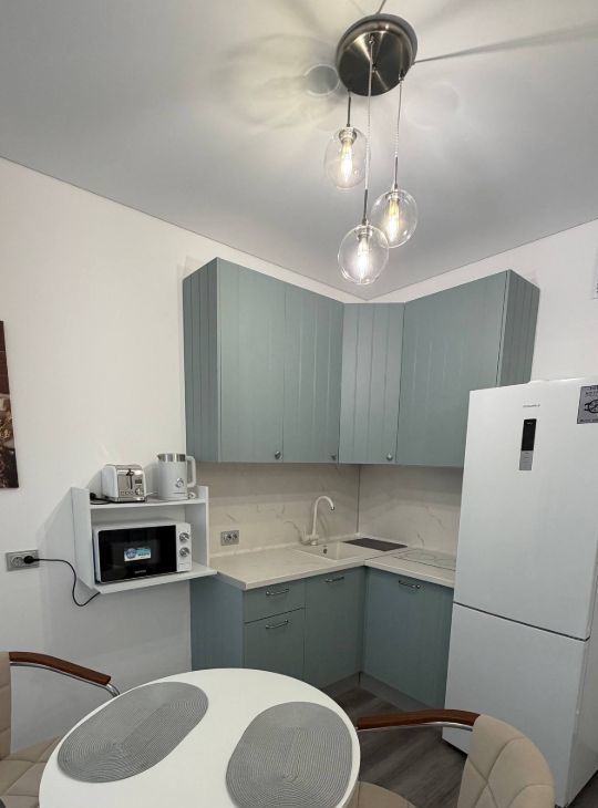 Кухня: индукционная варочная панель, вытяжка, холодильник, микроволновая печь, электрический чайник,тостер.